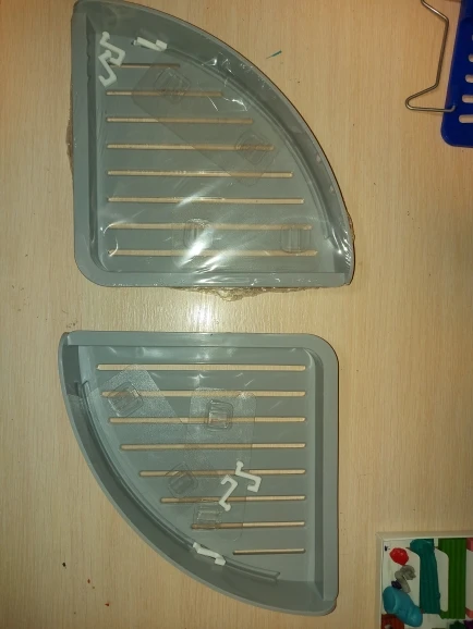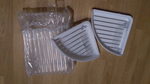 Посылка пришла очень быстро. Упаковано прилично, воздушная коробка. Пластик мягкий, не хрупкий. Клеевые накладки имеют очень прочную клеевую основу, после приклейки не оторвать.Накладки клеить внимательно, можно приклеить очень криво, запасные в комплект не входят. Полку устанавливать можно с большим усилием, накладки не оторвутся. Продавца рекомендую.