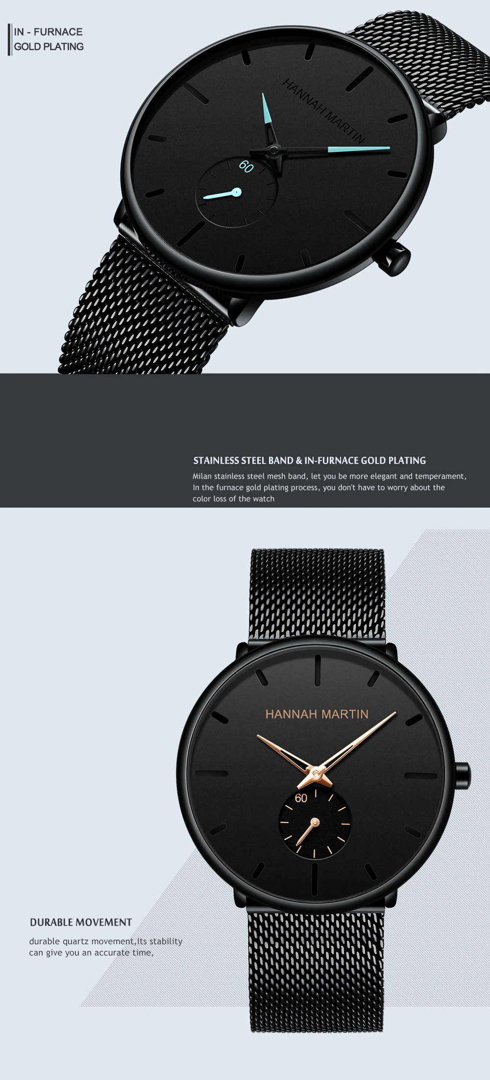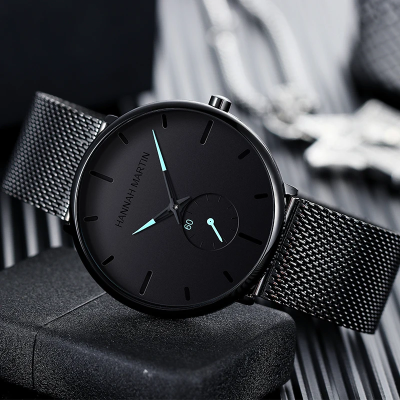 Мужские часы Hannah Martin, черные сетчатые часы из нержавеющей стали с маленьким циферблатом, Роскошные Кварцевые наручные часы от ведущего бренда, relogio masculino