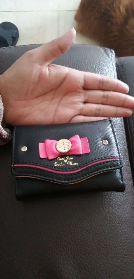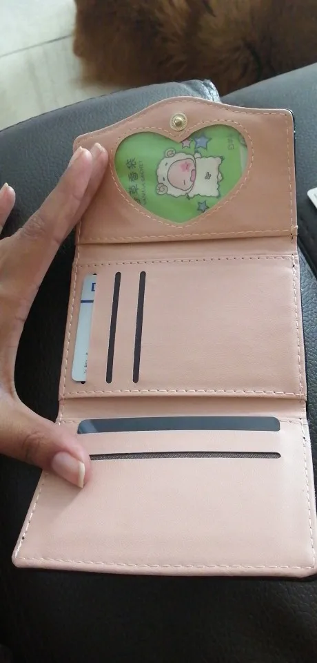 Очень милый кошелёк. Немного уголок только ободран, но это не сильно заметно. Немного меньше оказался, чем думала.Минус только , что нет отделения для мелочи.