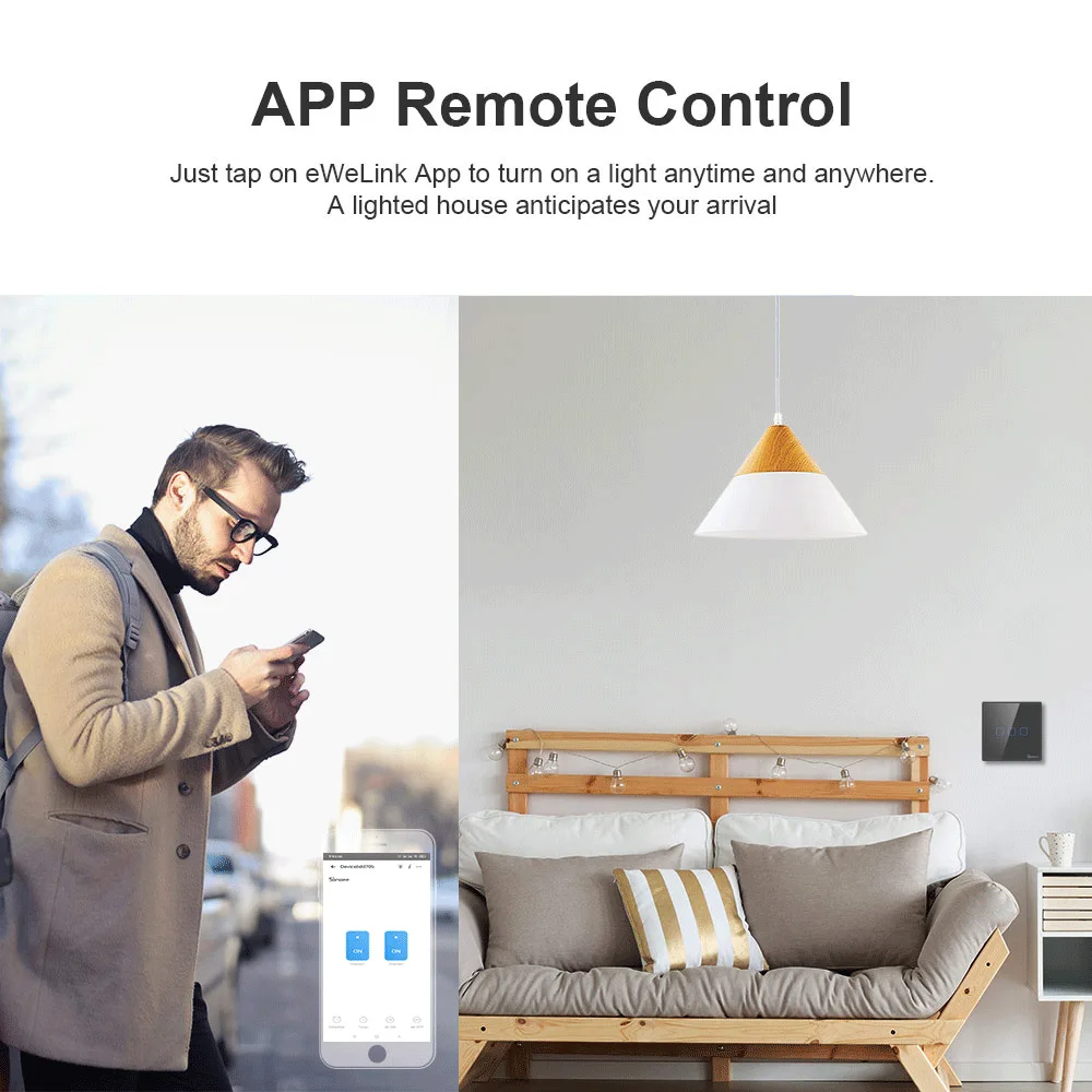 Все переключатели можно управлять удаленно с помощью телефона, а устройства, подключенные к переключателям, могут работать независимо. Работает с Amazon Alexa и Google Assistant, который позволяет включать или выключать ваши устройства с голосовой командой, идеально подходит для тех, кто должен обрабатывать много домашней работы одновременно. Особенности чувствительных сенсорных кнопок, которые крепятся на простых и стильных переключателях, чтобы обеспечить современное и приятное украшение на любой поверхности стены. Небольшой кран для более легкого управления. Если вы беспокоитесь о том, что ваш ежемесячный счет за электричество перегружен энергопотребителями или хотите включить кофеварку, пока вы сидите на диване, график времени-хороший выбор. Установите время для устройств, и переключатели помогут вам включить или выключить их автоматически. Портной смарт-сцена для ваших приборов. Просто установите событие, чтобы вызвать одно устройство SONOFF или группы устройств с помощью нажатия на вашем телефоне. Ваши устройства не будут работать из-за аномальной сети Wi-Fi, управление локальной сети, следовательно, разработано, чтобы убедиться, что они могут нормально работать.Совместим с функцией IFTTT, переключатели могут взаимодействовать с множеством устройств и услуг, чтобы включить или выключить их. Есть несколько сложных шагов, когда мы начинаем получать доступ к умному дому, для сопряжения, введите учетную запись и пароль, имя и так далее. Управление share обеспечивает быстрый способ, позволяющий вам и вашей семье управлять устройствами вместе. Вы не уверены, выключаете ли нагреватель, когда выходите из дома, Просто вытащите свой телефон и откройте приложение eWeLink, чтобы проверить состояние устройства в режиме реального времени.