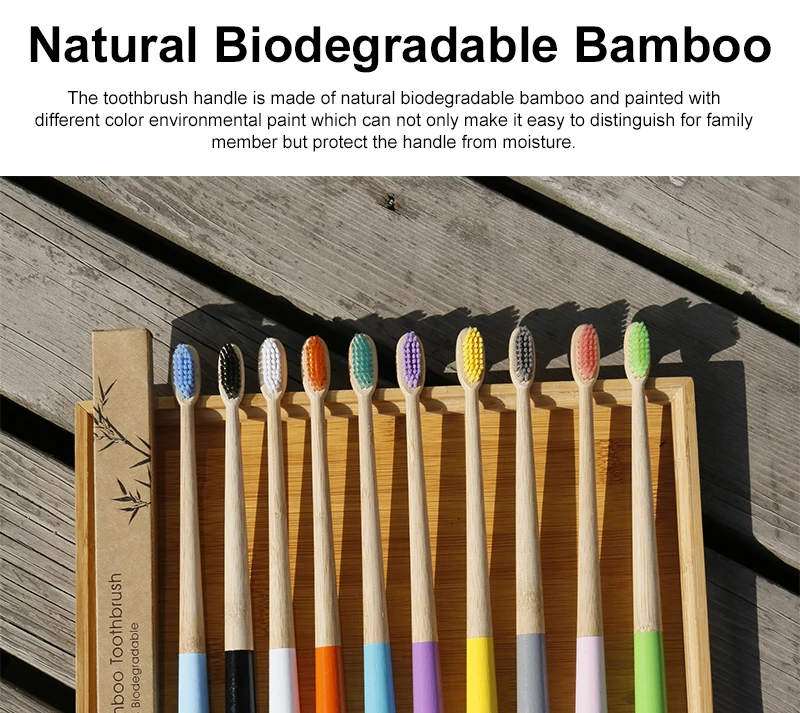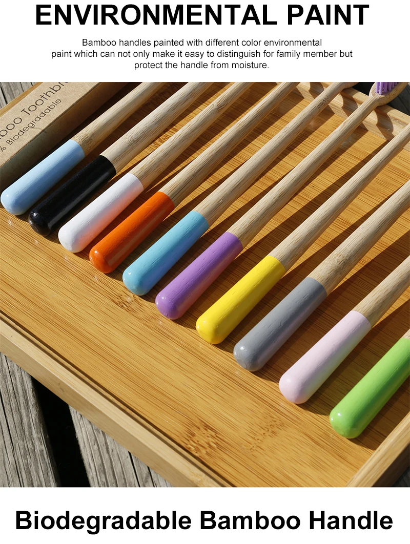 Бамбуковые ручки, окрашенные экологической краской разного цвета, которые не только позволяют легко отличить членов семьи, но и защищают ручку от влаги. Биоразлагаемая бамбуковая ручка Ручка зубной щетки изготовлена из натурального биоразлагаемого бамбука и окрашена экологической краской разного цвета, которая не только позволяет легко отличить члена семьи, но и защищает ручку от влаги.