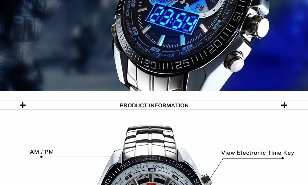1. Абсолютно новый и 100% высококачественный.2. Чехол изготовлен из нержавеющей стали 304.3. Есть функция времени, даты и недели. И это очень легко читать время, подсчитав синий светодиод непосредственно на кольцевом циферблате.4. Материал ремешка: нержавеющая сталь5. Тип: указатель светодиодный6. Кнопка часов: Двойная застежка-бабочка7 светодиодный: суперъяркая светодиодный ная лампа.8. Водонепроницаемость: Глубина водонепроницаемости9: часы: есть подсказки и светильник сказки