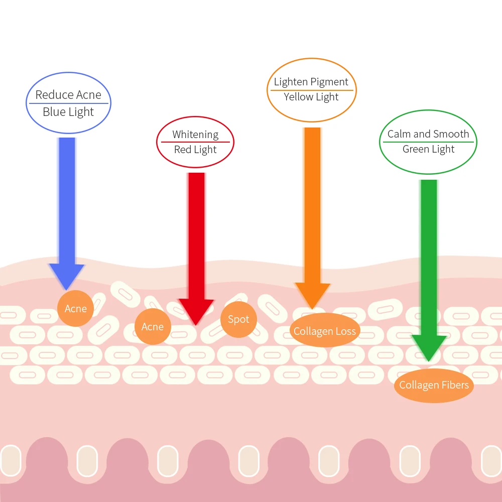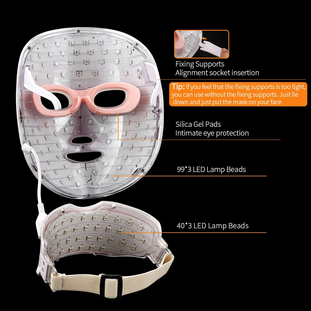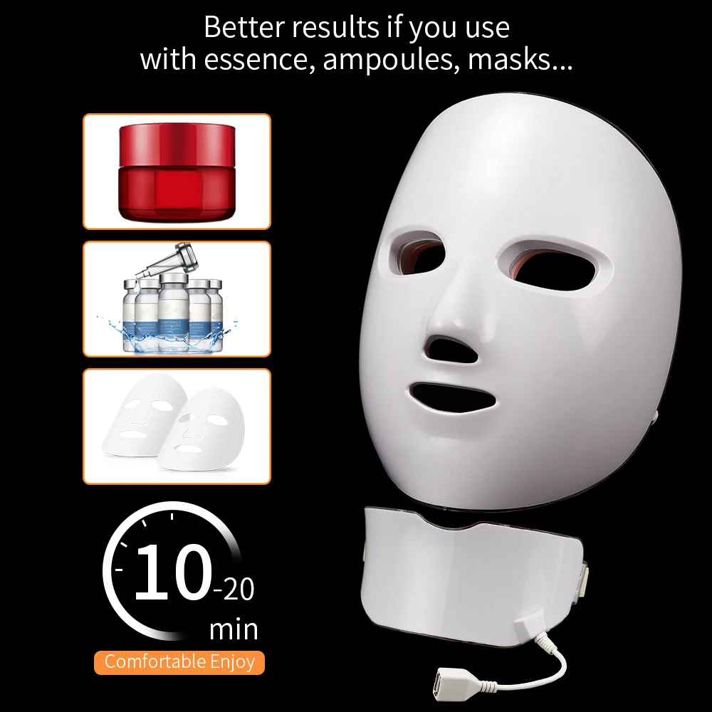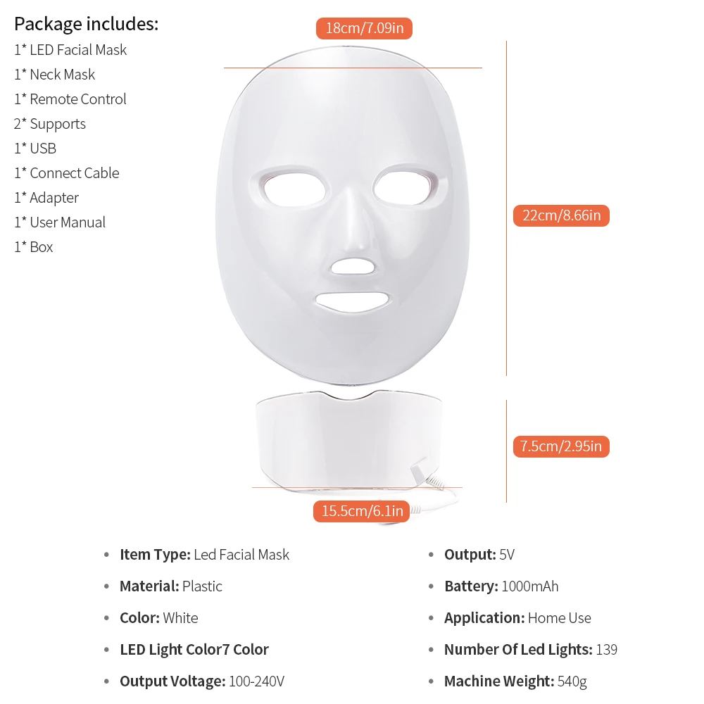 Особенности:1. Изготовлен из экологически чистого АБС-материала, нетоксичный, без запаха, здоровый и прочный.2,7 огней красного, синего, зеленого, желтого, фиолетового, белого и голубого света и могут быть выбраны в зависимости от ваших потребностей.3. Каждый свет имеет 5 передач для регулировки интенсивности света.4. Светодиодная маска для фототерапии содержит 139*3 положения ламп. (маска: 99*3/Шея: 40*3)5. Без операции, без иглы, безопасная и быстрая обработка и защита кожи.6. Маска повторяет контур лица для удобной и подходящей носки.7. Подходит для любого типа кожи.Функция светового сигнала:1. Красный свет: повышает активность клеток, ускоряет метаболизм и способствует коллагену.2. Зеленый свет: нейтрализация, баланс и стабильность, может уменьшить секрецию масла кожи.3. Синий свет: бактерицидный противовоспалительный, подавляет воспаление, восстанавливает кожу.4. Желтый свет: улучшает клеточный кислородный обмен, восполняет энергию клеткам кожи.5. Фиолетовый свет: двойной Частотный свет, ремонт акне.6. Голубой свет: усиливает энергию клеток и способствует метаболизму.7. Белый свет: улучшает тонкие линии и распущенную кожу.Примечание:1. Не смотрите светодиодный источник света напрямую в течение длительного времени.2. Не читать книги, смотреть телевизор, серфить в Интернете при использовании фотонной маски.3. Внутри силиконовой маски имеются светодиодные источники света и печатная плата. Не складывается, не сдавливается, не давит.4. Не используйте воду для очистки светодиодной маски, Не погружайте в воду. Пожалуйста, используйте влажную ткань для очистки светодиодной маски.5. Не используйте химическую жидкость для очистки светодиодной маски и смягчающую маску.6. Не подвергайте воздействию солнечного света.Советы:1. Должны лежать во время использования.2. Эффект будет лучше, если использовать с высококачественным увлажняющим средством для ухода за кожей.3. Материал маски медицинский кремний, который будет иметь некоторый запах после открытия упаковки, но запах исчезнет очень скоро.