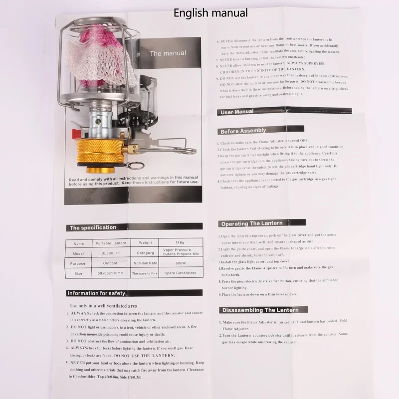 Миниатюрный дизайн, используя высокопрочный светильник из алюминиевого сплава и нержавеющей стали, высокотемпературный устойчивый плафон из закаленного стекла, тонкая стена и хорошая устойчивость к разрушению, яркость до 80LUX, высокоэнергетическая керамическая пьезоэлектрическая система зажигания