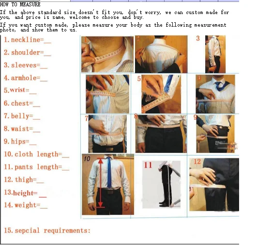 Если вы хотите сделать заказ, пожалуйста, Измерьте свое тело, как на следующем фото измерения, и покажите их нам.