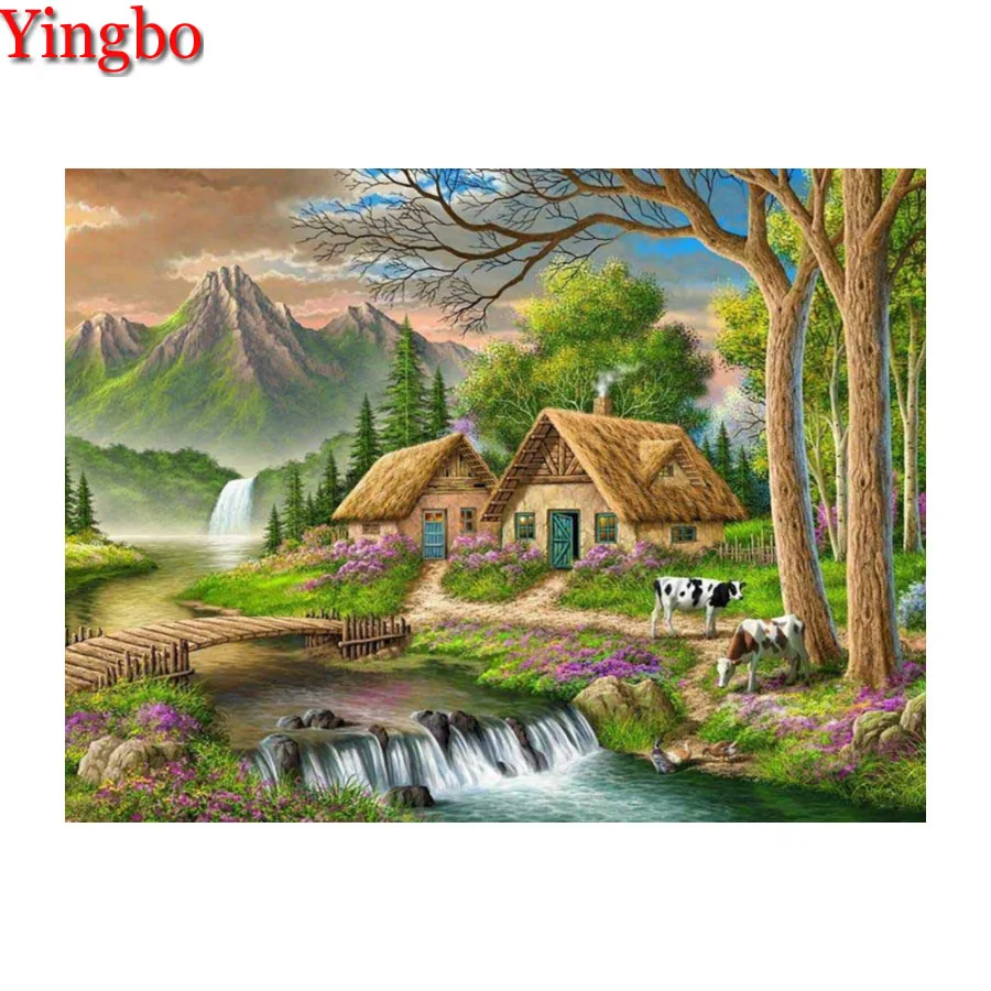 Алмазная живопись 5d "сделай сам", наборы для вышивки крестиком, картина с изображением природы, деревни, дома, алмазная вышивка, декор из коровы и реки