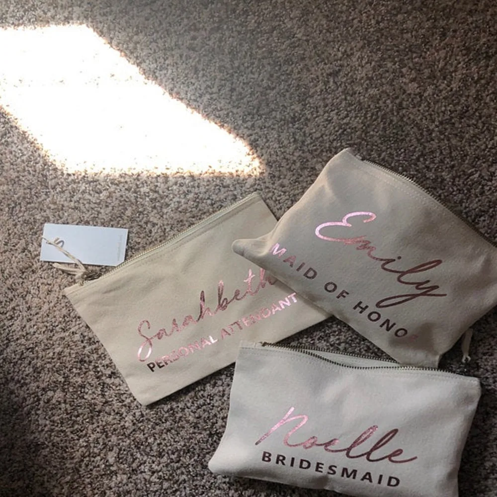 Эта восхитительная косметичка изготовлена из хлопка или полиэфирного полотна-можно заказать в черном, красном, сером, ярко-розовом, натуральном, темно-синем, фиолетовом, красном, бирюзовом или белой сумочка для косметики с золотой молнией! Это идеальный подарок для вашей свадебной вечеринки.