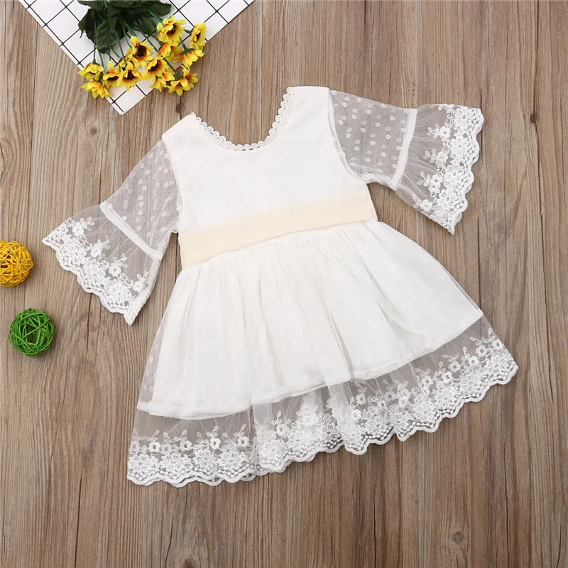 Весеннее белое платье подружки невесты для девочек, модное праздвечерние чное кружевное платье до колена с длинным рукавом и бантом для маленьких детей, свадебные платья принцессы