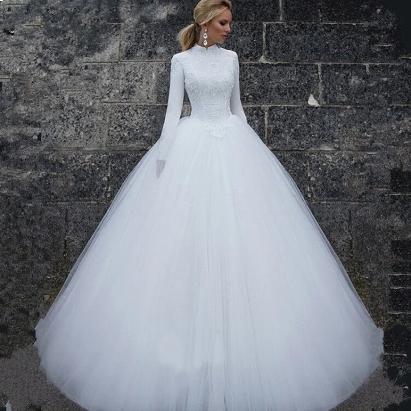 Белое мусульманское свадебное платье с высоким воротником и длинным рукавом, кружевное свадебное платье из Дубая, арабское свадебное платье, свадебное платье