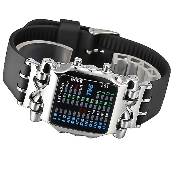 Cool 21 цветной светодиодный цифровой наручные часы черного цвета с цветным светодиодный дисплеем, чехол из нержавеющей стали с черной отделкой и интегрированным силиконовым ремешком. Он может отображать время и дату, а также неделю. Более того, степень яркости регулируется. Кроме того, светодиодный светильник 21 цвета отличаются и красочны. Этот забавный светодиодный часы гарантированно привлекают внимание и вопросы, куда бы вы ни отправились!