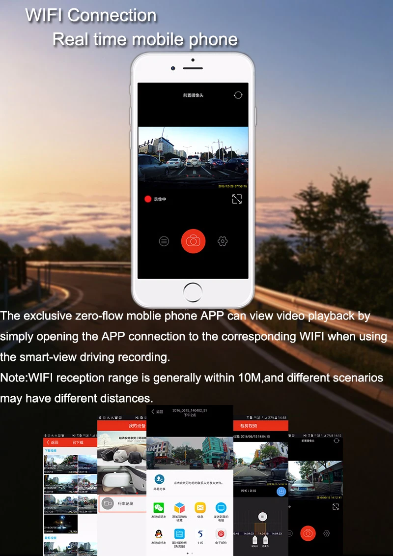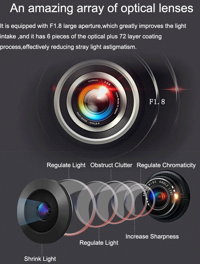 2.Ночное видение высокой четкости 1080P, широкий угол 170 °, камера высокой четкости 1200 Вт, разрешение до 1920*1080P, трехосевой стерео датчик ускорения столкновения. Циклическая запись, Автоматическое покрытие, бесшовная связь между видео, без секунд.
