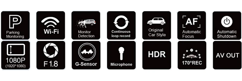 24 часа монитор парковкиЕсли видеорегистратор шокирован какими-либо внешними силами, такими как вор во время парковки, функция режима парковки автоматически включается для записи (Теплое напоминание, он должен использоваться с кабелем питания)