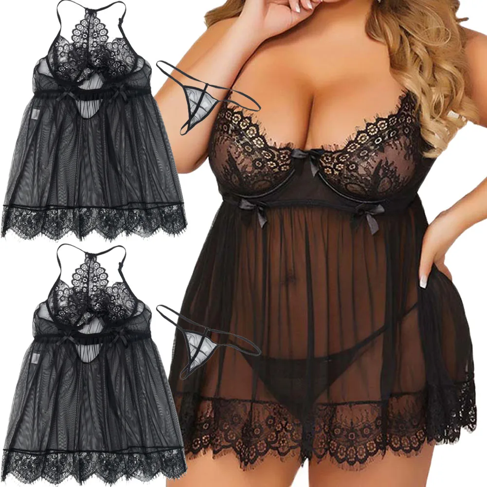 Сексуальное кружевное белье для женщин, ночная рубашка с прозрачными лямками для спагетти размера плюс