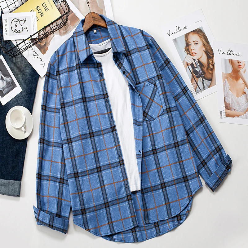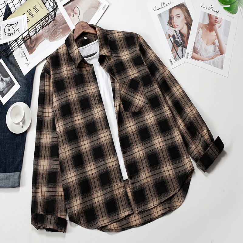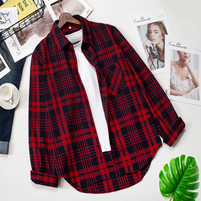 Клетчатые рубашки, Женский Топ и блузки с длинным рукавом, оверсайз, Хлопковые женские повседневные блузы, Свободная Женская рубашка в клетку с одним карманом, 2022