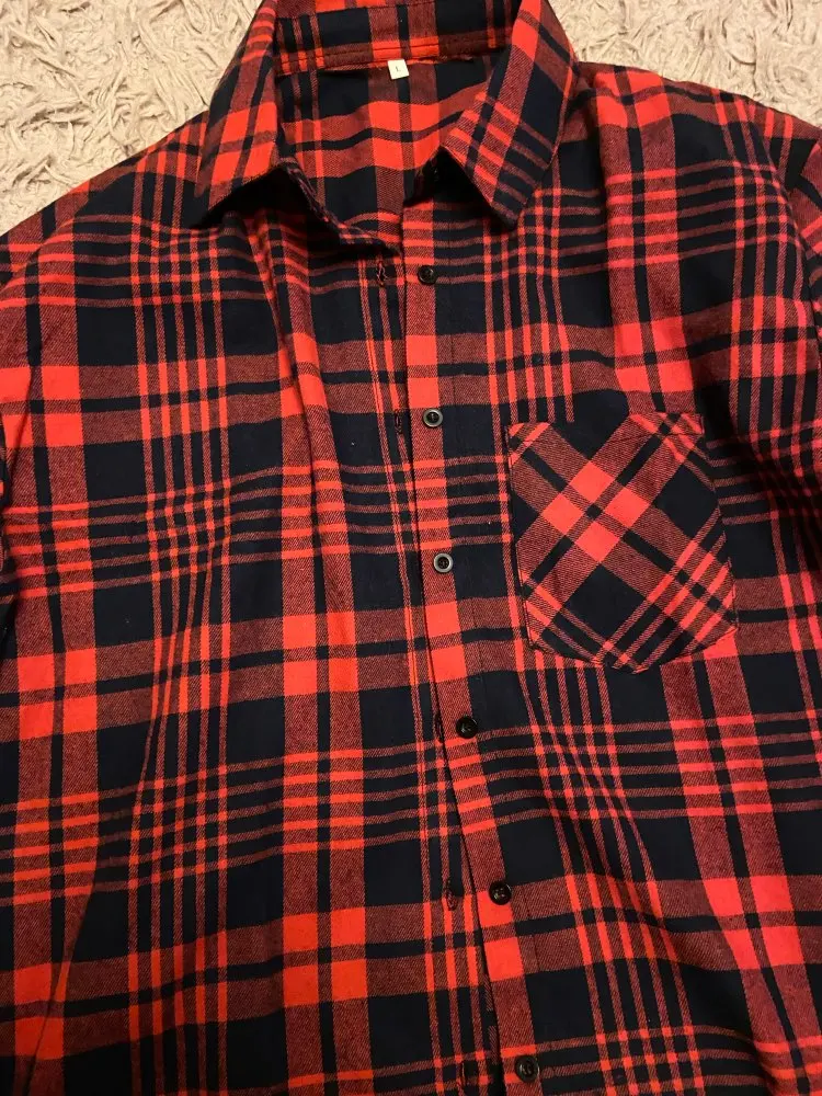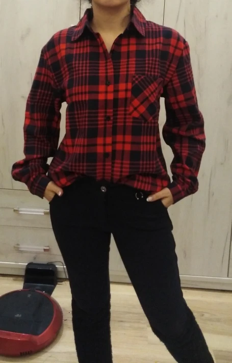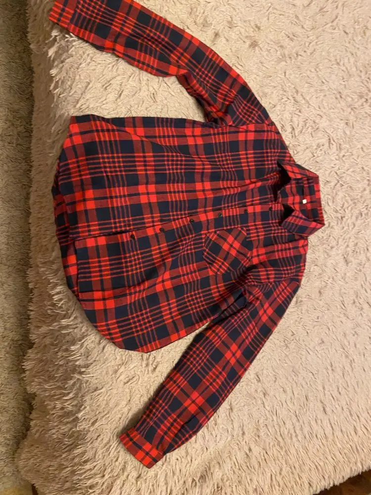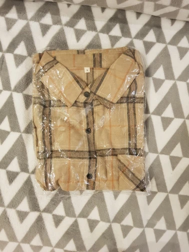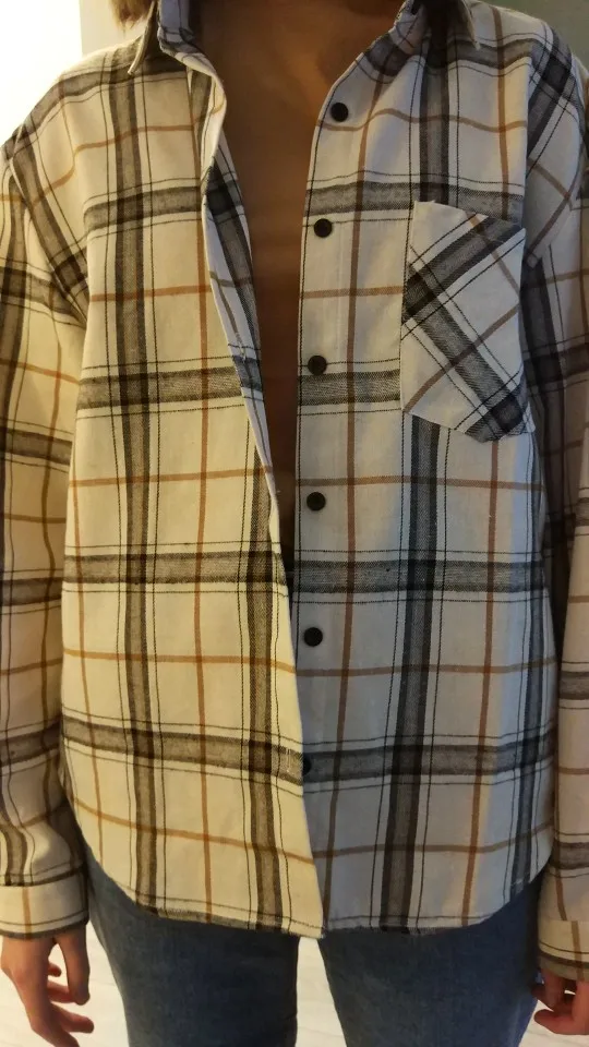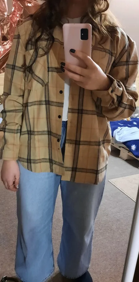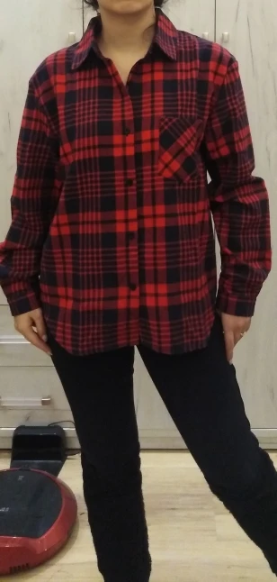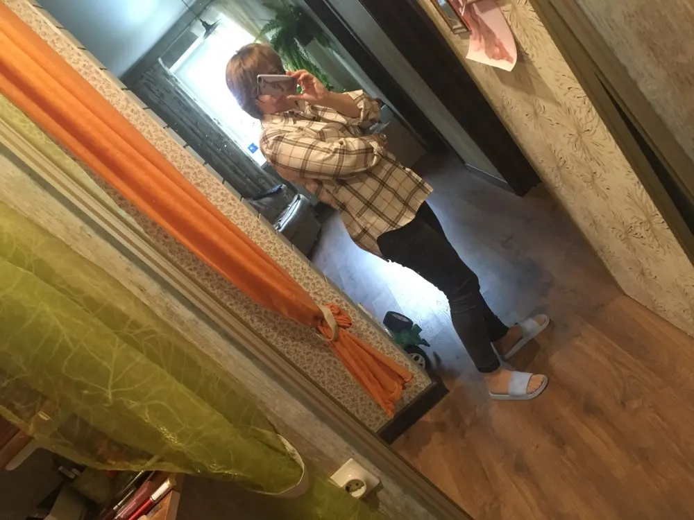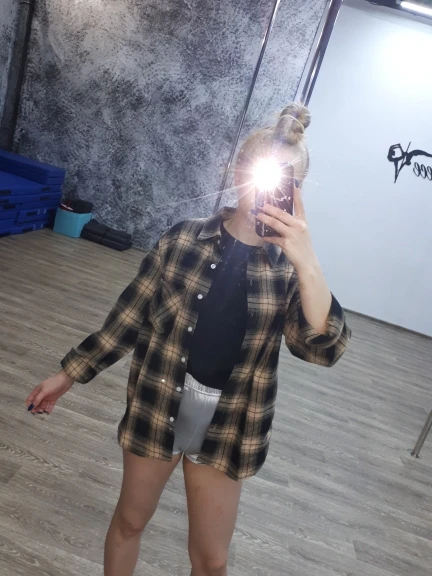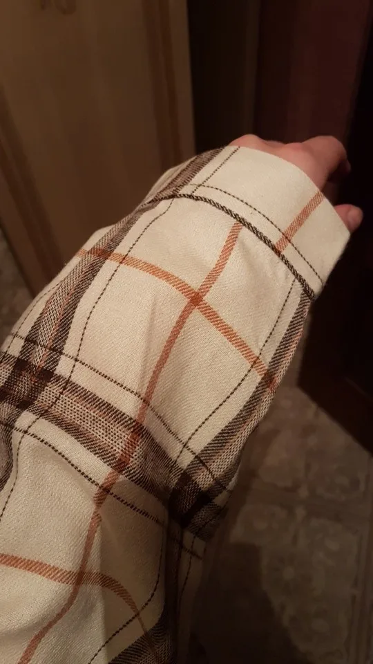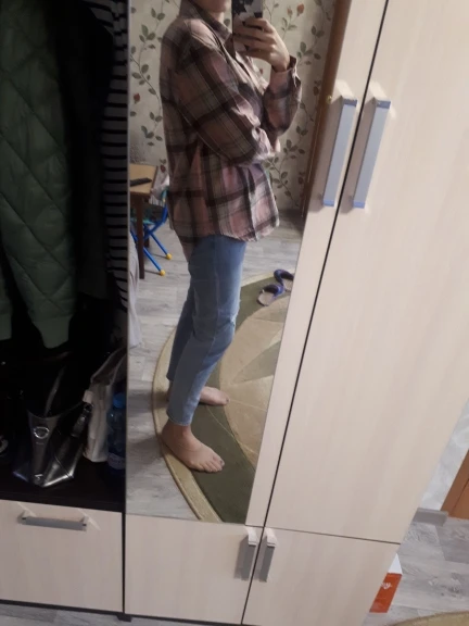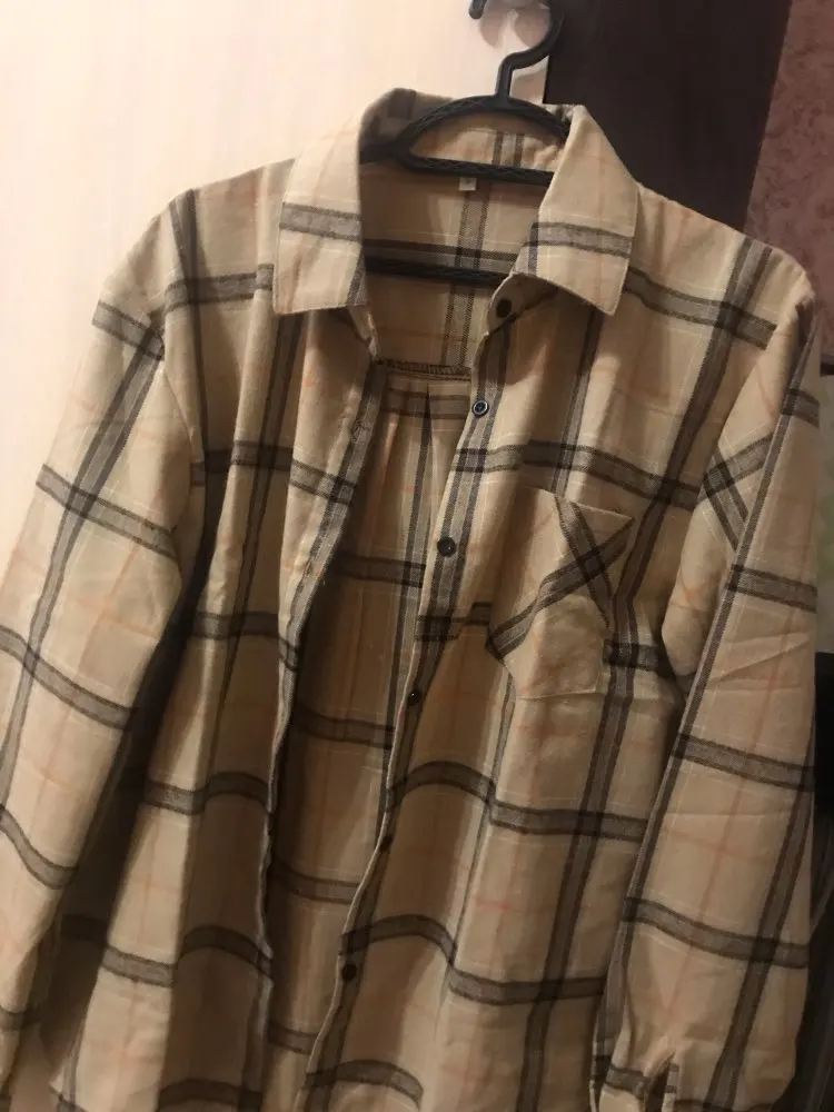 Продавец очень быстро отправил посылку. Приятная на ощупь. Будто байка, но это не так. По идее хлопок. Цвет немного грязноват. но приятный. На фотографии это передать не получилось. Рубашка оверсайз для меня. На одном рукаве нет дырки для пуговички, хотя петелька сделана. Кое-где есть нитки. Прикрывает попу. Больше подходит для того, чтобы носить поверх чего-то. Сами рукава длинные, хотя боялась, что будут коротковаты. Нет никаких бирок о составе