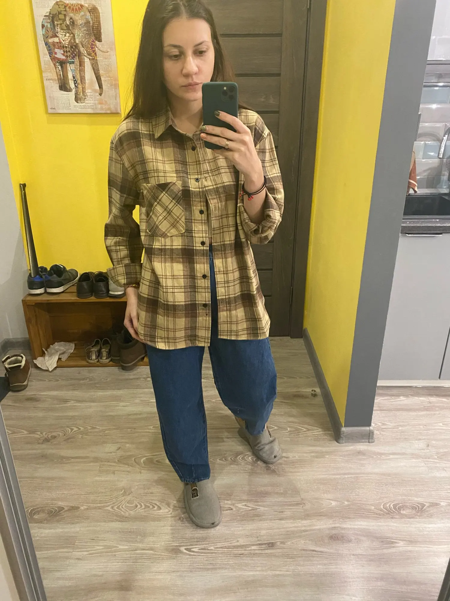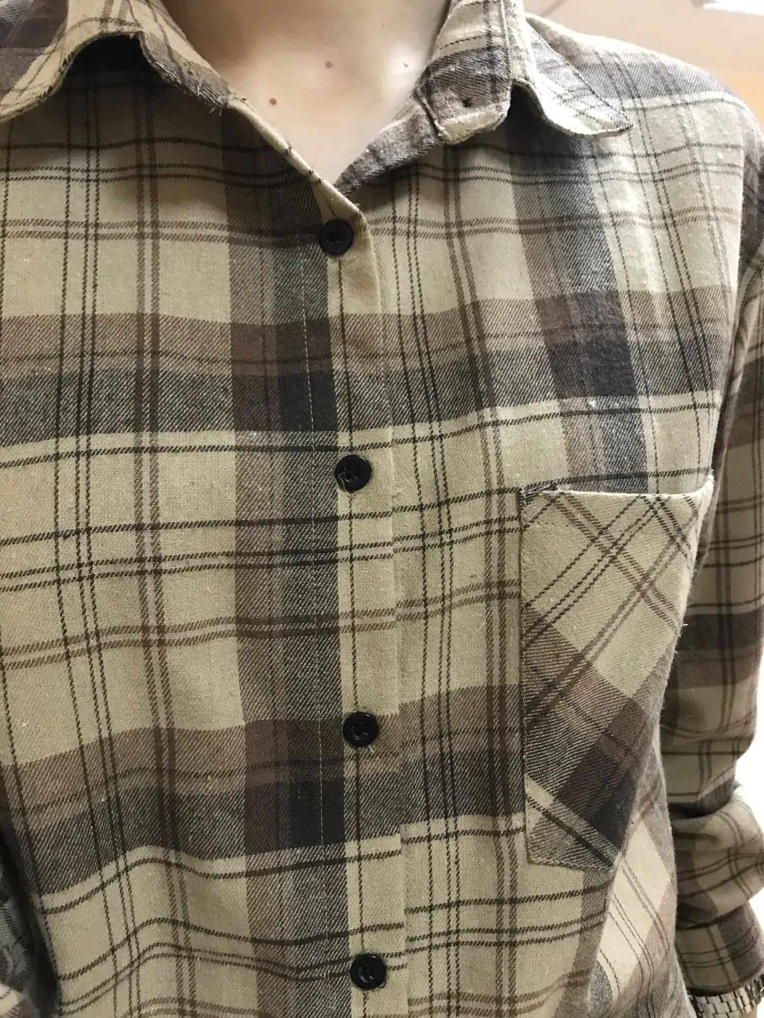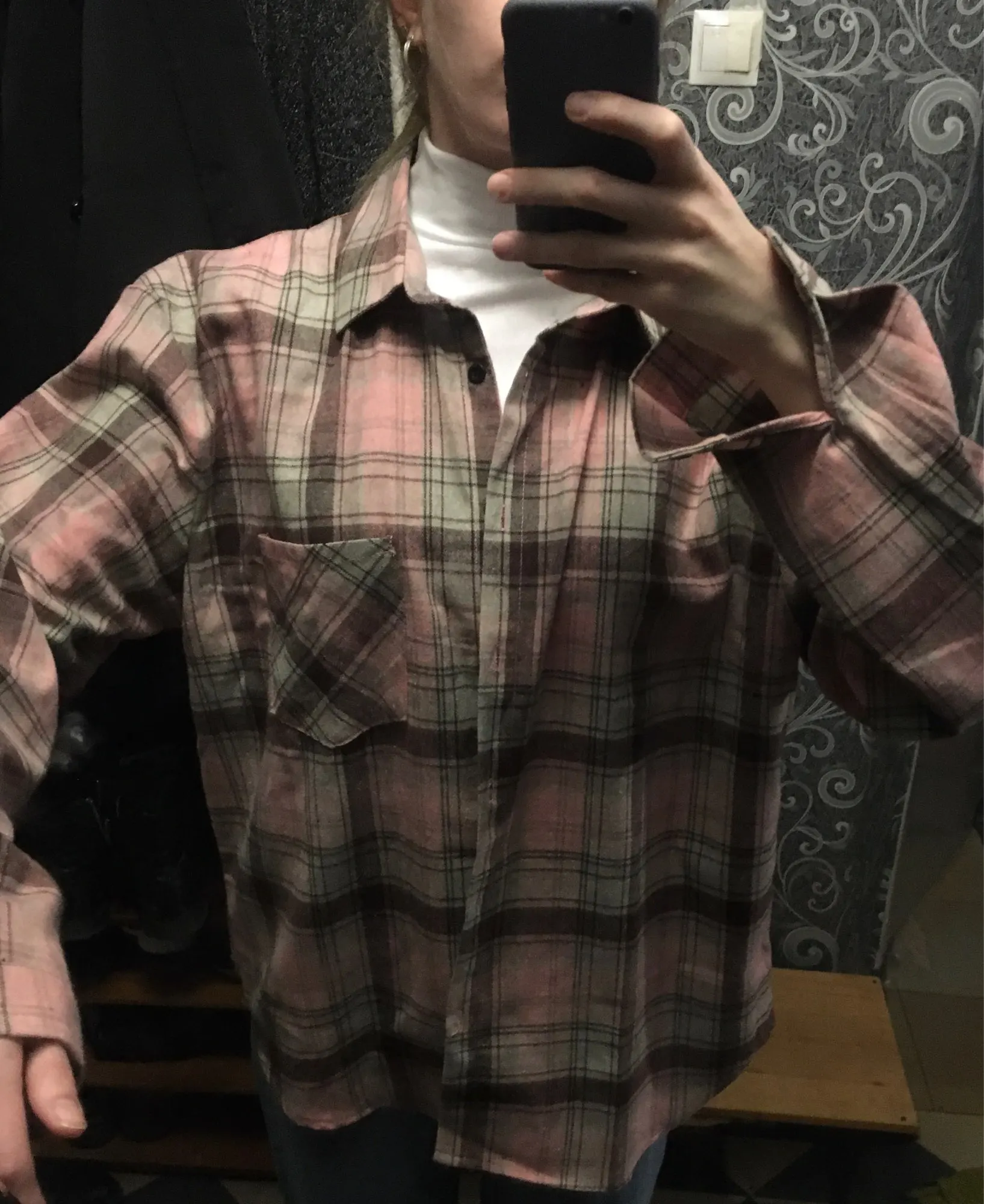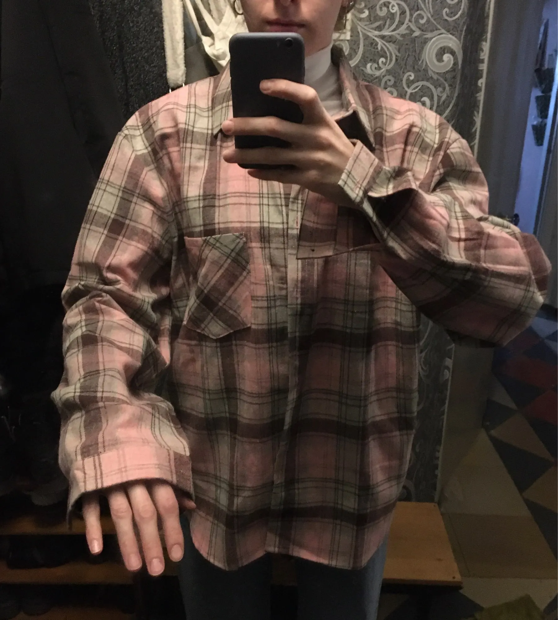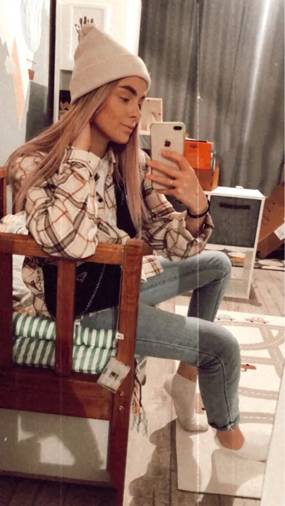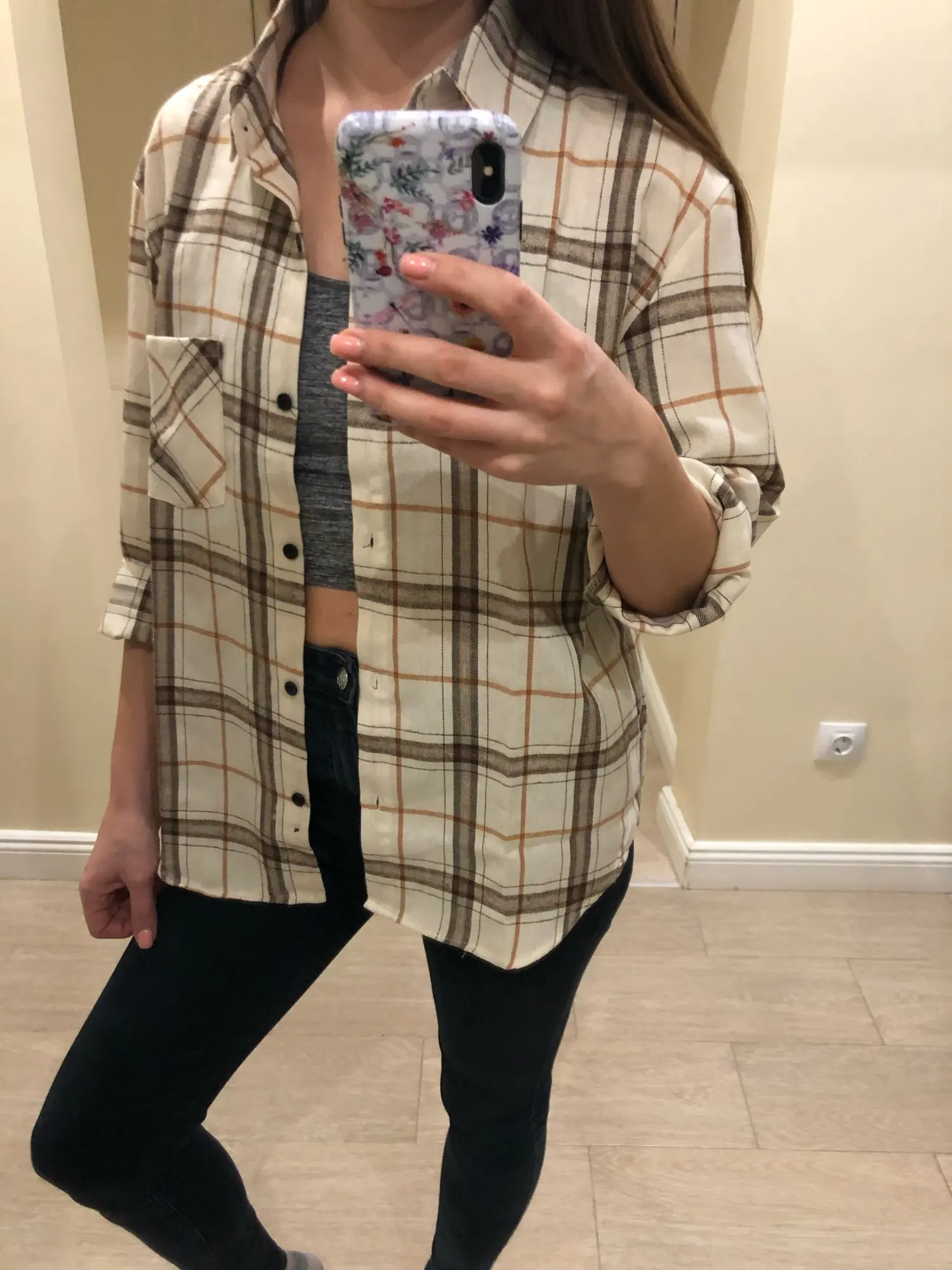 Продавец очень быстро отправил посылку. Приятная на ощупь. Будто байка, но это не так. По идее хлопок. Цвет немного грязноват. но приятный. На фотографии это передать не получилось. Рубашка оверсайз для меня. На одном рукаве нет дырки для пуговички, хотя петелька сделана. Кое-где есть нитки. Прикрывает попу. Больше подходит для того, чтобы носить поверх чего-то. Сами рукава длинные, хотя боялась, что будут коротковаты. Нет никаких бирок о составе