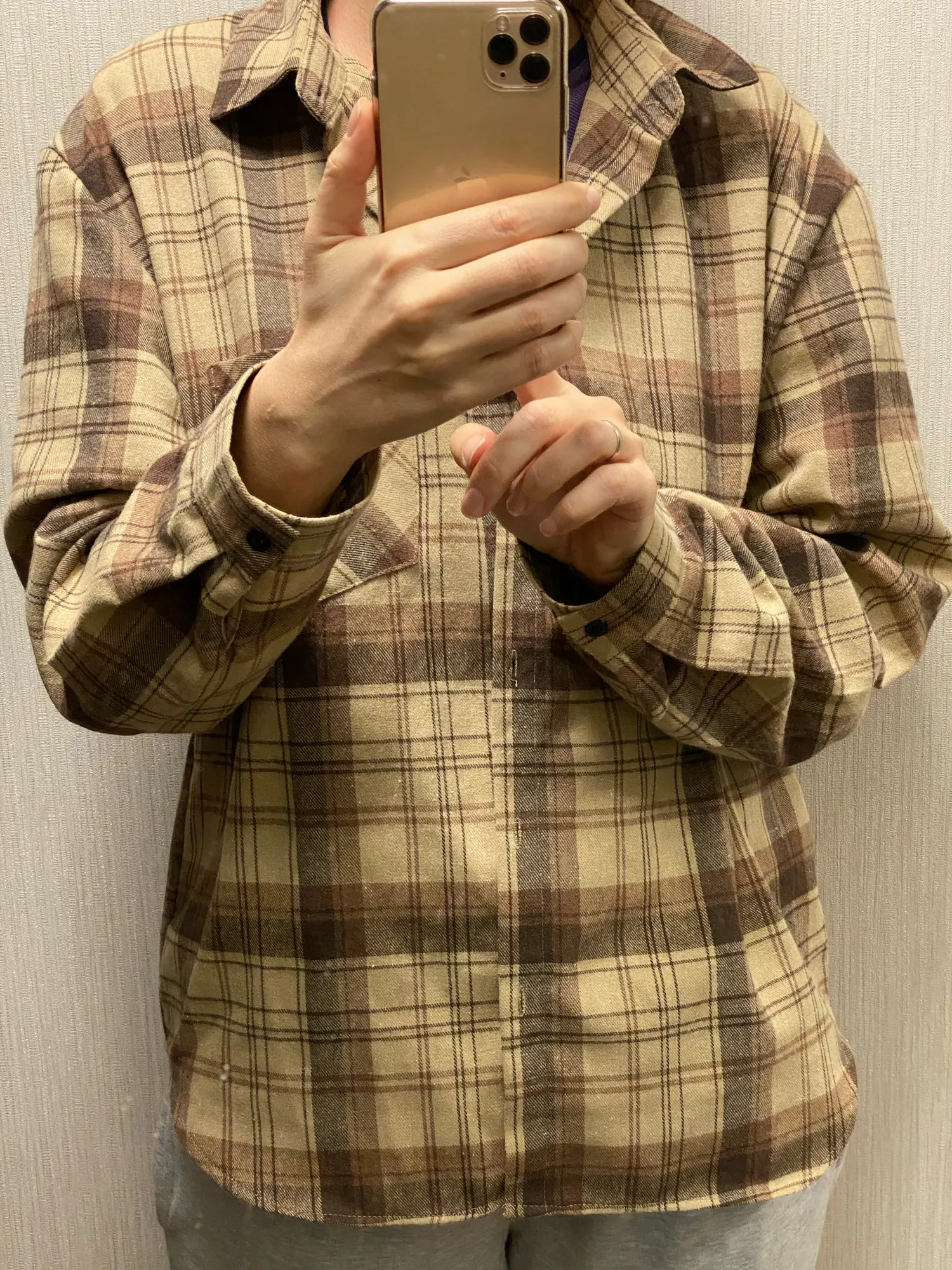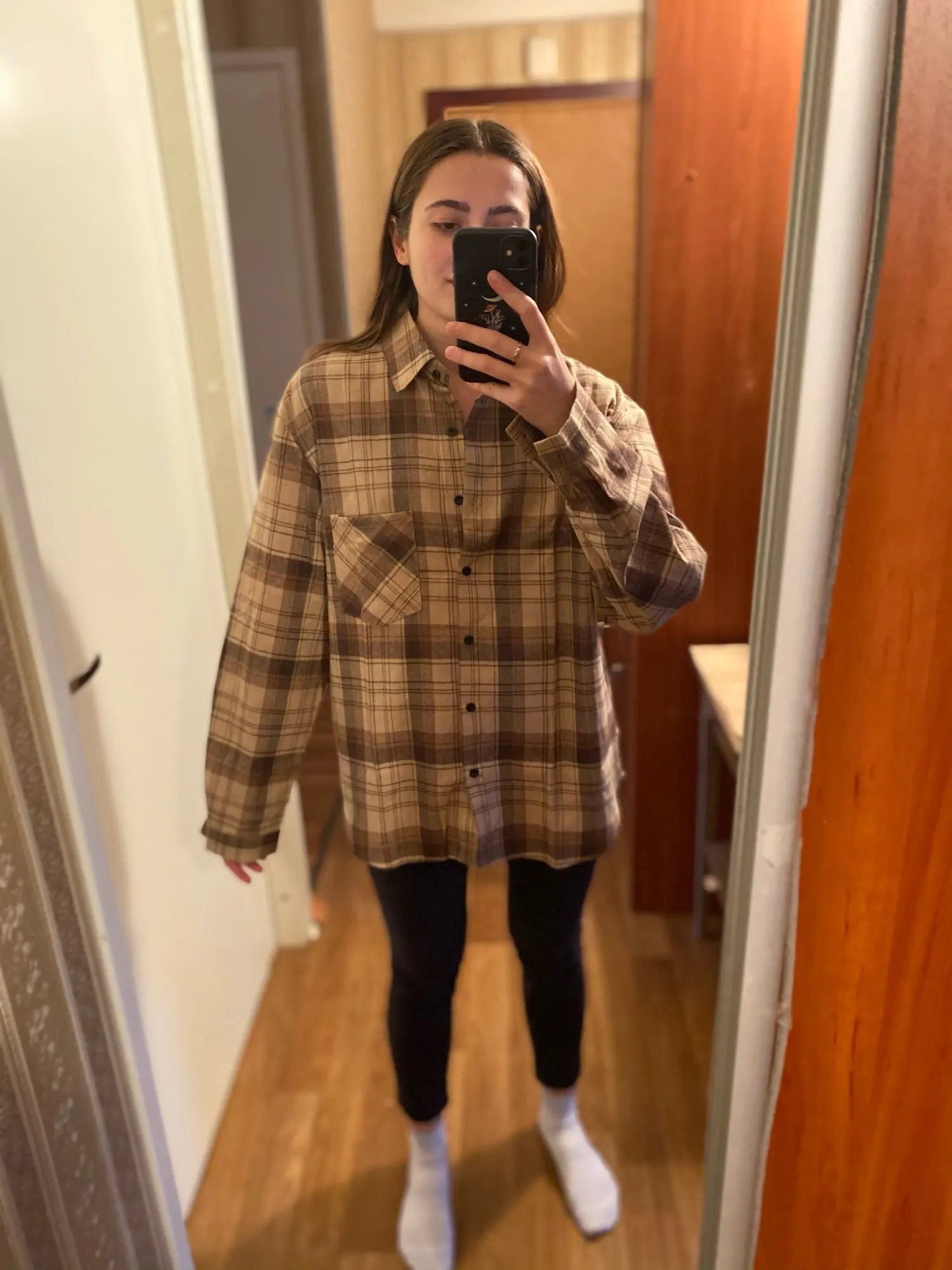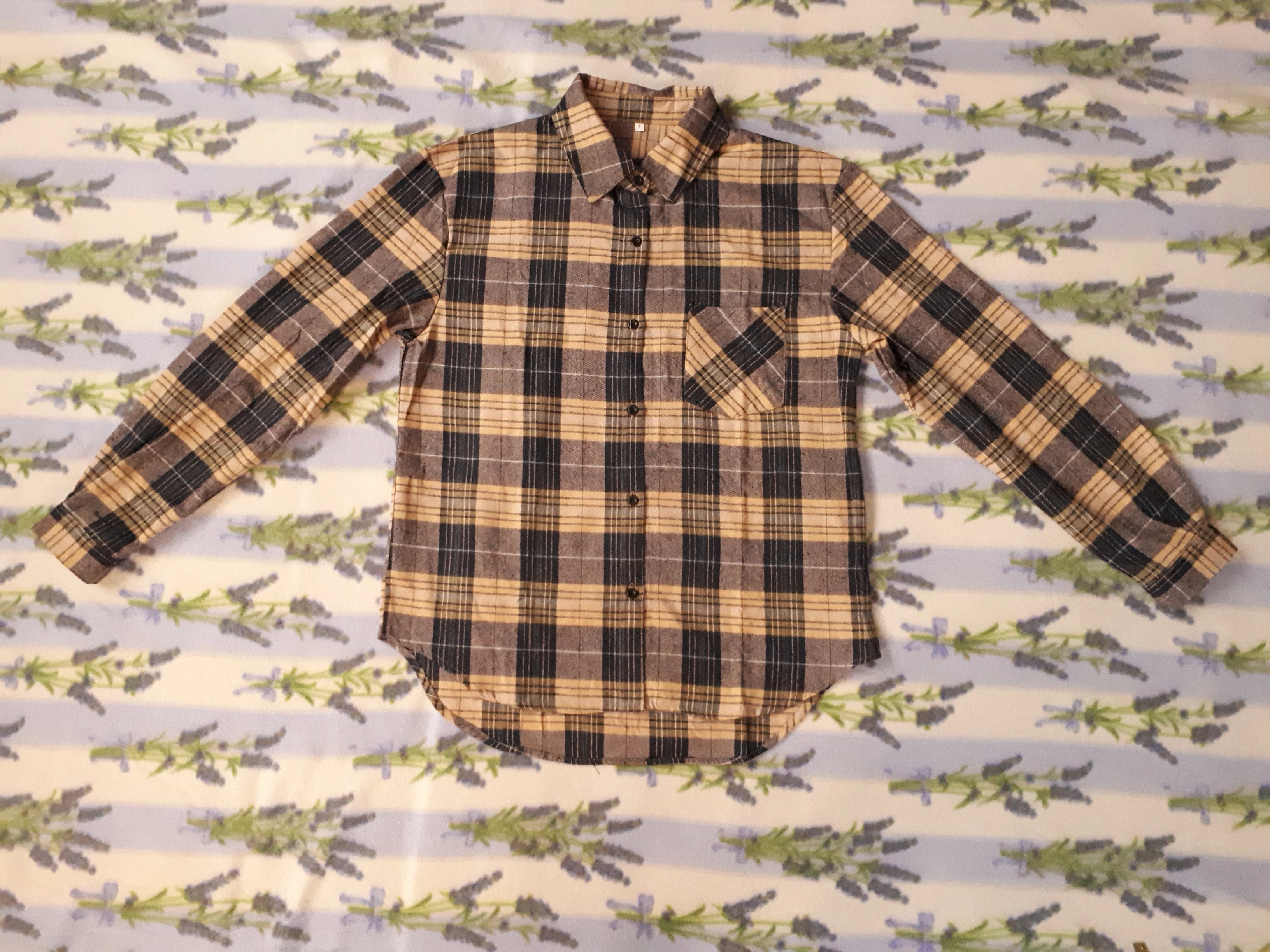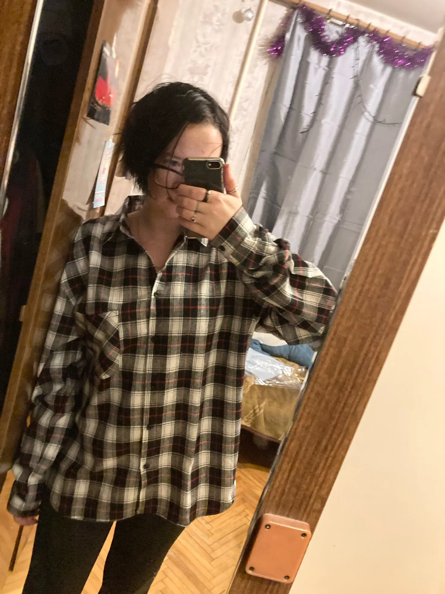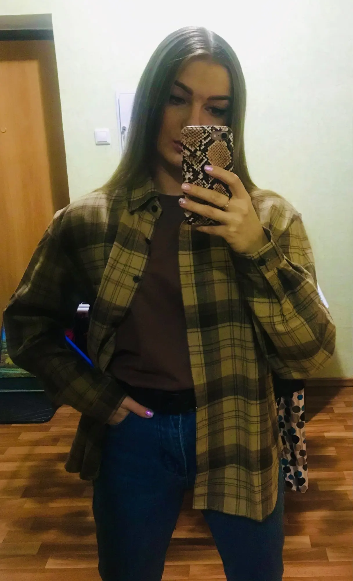 Продавец очень быстро отправил посылку. Приятная на ощупь. Будто байка, но это не так. По идее хлопок. Цвет немного грязноват. но приятный. На фотографии это передать не получилось. Рубашка оверсайз для меня. На одном рукаве нет дырки для пуговички, хотя петелька сделана. Кое-где есть нитки. Прикрывает попу. Больше подходит для того, чтобы носить поверх чего-то. Сами рукава длинные, хотя боялась, что будут коротковаты. Нет никаких бирок о составе