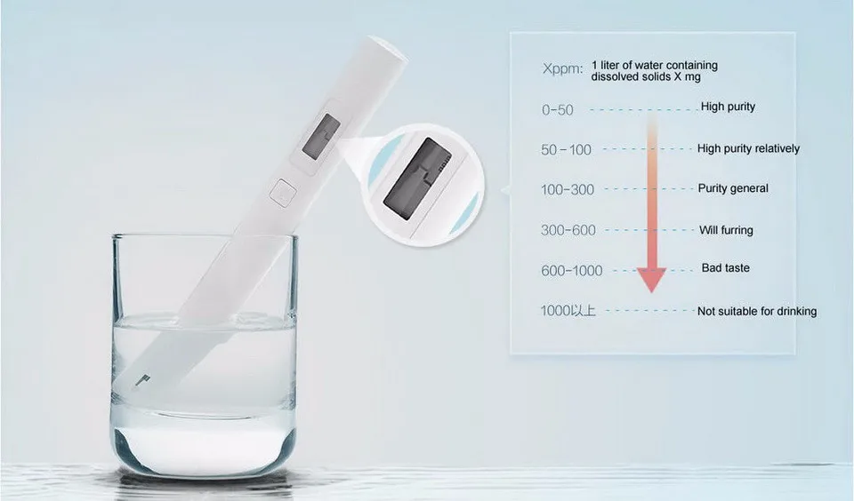 Простой в использовании, просто один клик, вы можете узнать качество воды, удобно использовать дома.