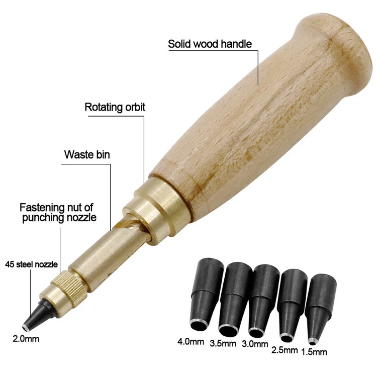 Особенности: Широкий спектр применения Широко используется в шитье, кожевенных изделиях, бумажных изделиях, печати и т. д. Легко установить Легко устанавливается и снимается, можно использовать повторно. Автоматический пробойник для ремней Автоматический дырокол, больше никаких забиваний. Легко носить Небольшой размер и портативность, легкий и простой в переноске, не занимает много места. Материал высокого качества Изготовлен из латуни с деревянной ручкой, прочный и устойчивый.