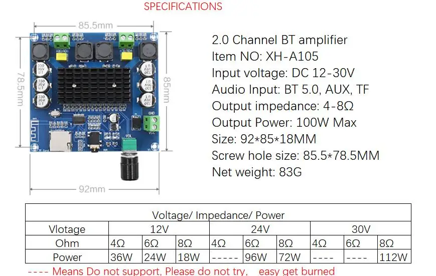 2,0 канальный BT усилитель Артикул: XH-A105 Входное напряжение: 12-30 В постоянного тока Аудиовход: BT 5,0, AUX, TF Выходное сопротивление: 4-8Ω Выходная мощность: 100 Вт макс. Размер: 92*85*18 мм Размер отверстия под винт: 85,5*78,5 мм Вес нетто: 83 г