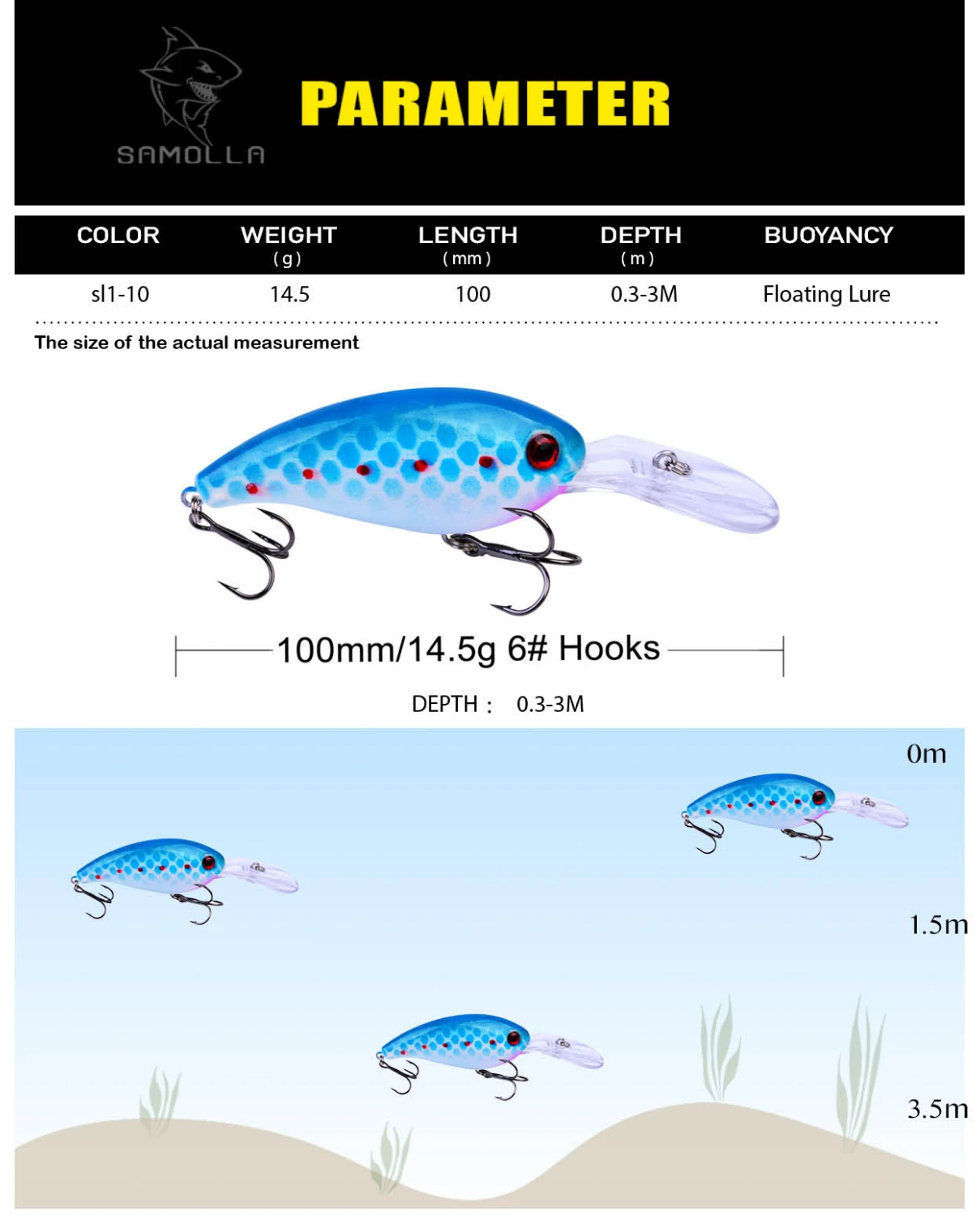 Информация о продукте: Бренд: SAMOLLA Модель приманки: crankbait Тип приманки: жесткая рыболовная приманка Приманка Вес: 14,5 г Длина приманки: 100 мм Глубина погружения: 0,3-3 м Плавучесть: Крючки: оснащены антикоррозийными крючками Глаза: 3D рыбий глаз Кольца: велосипедные Цвета: 10 цветов
