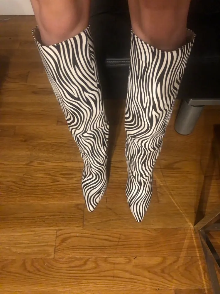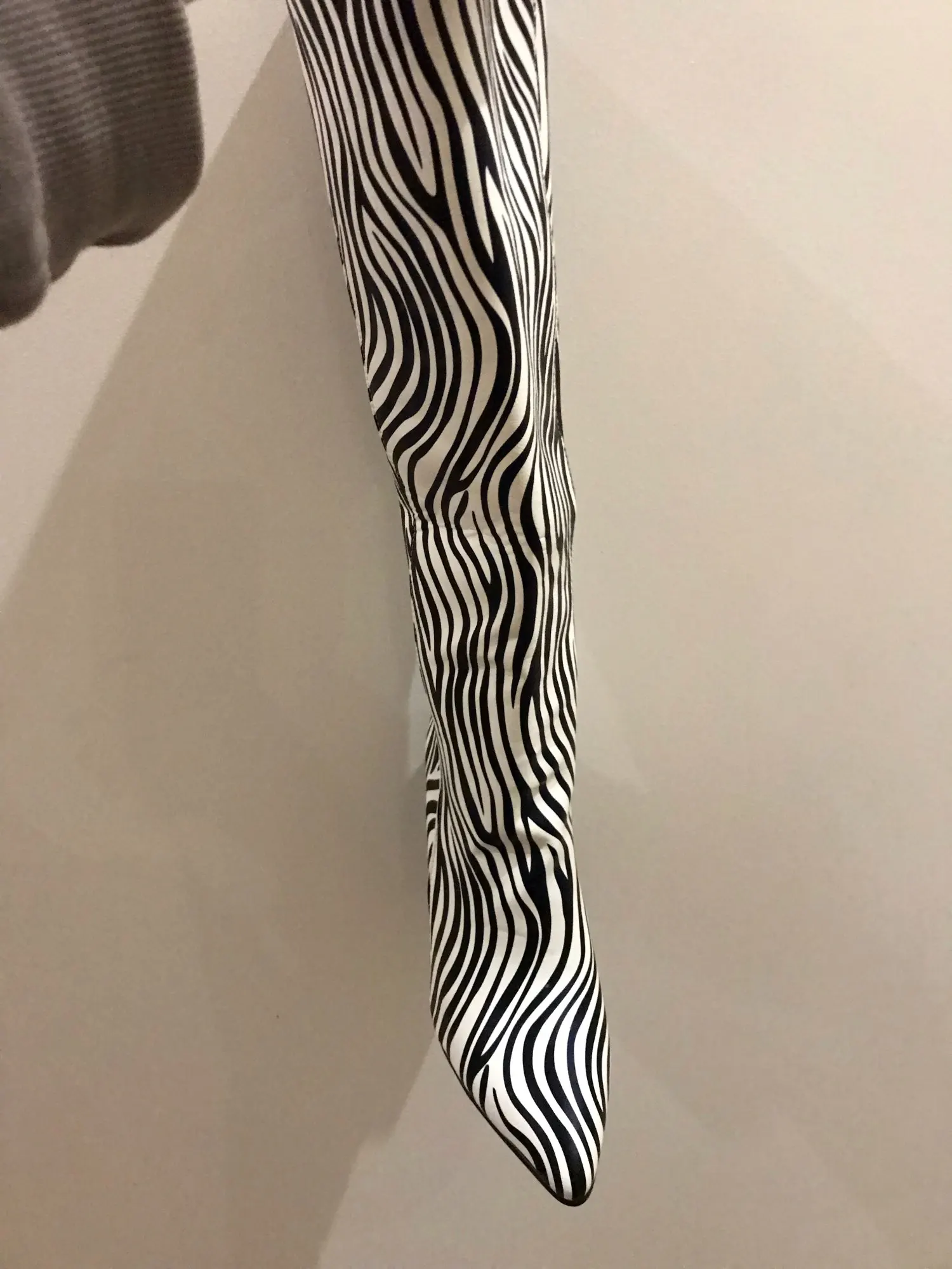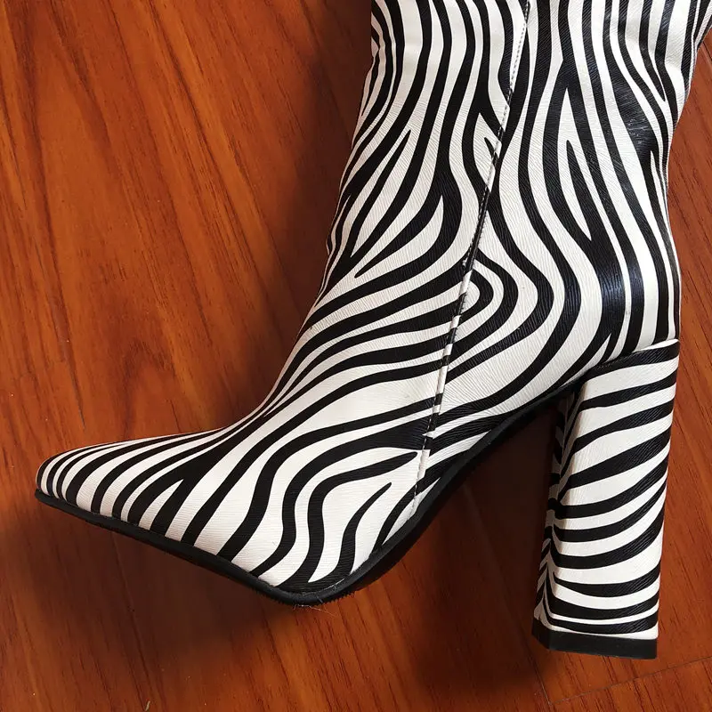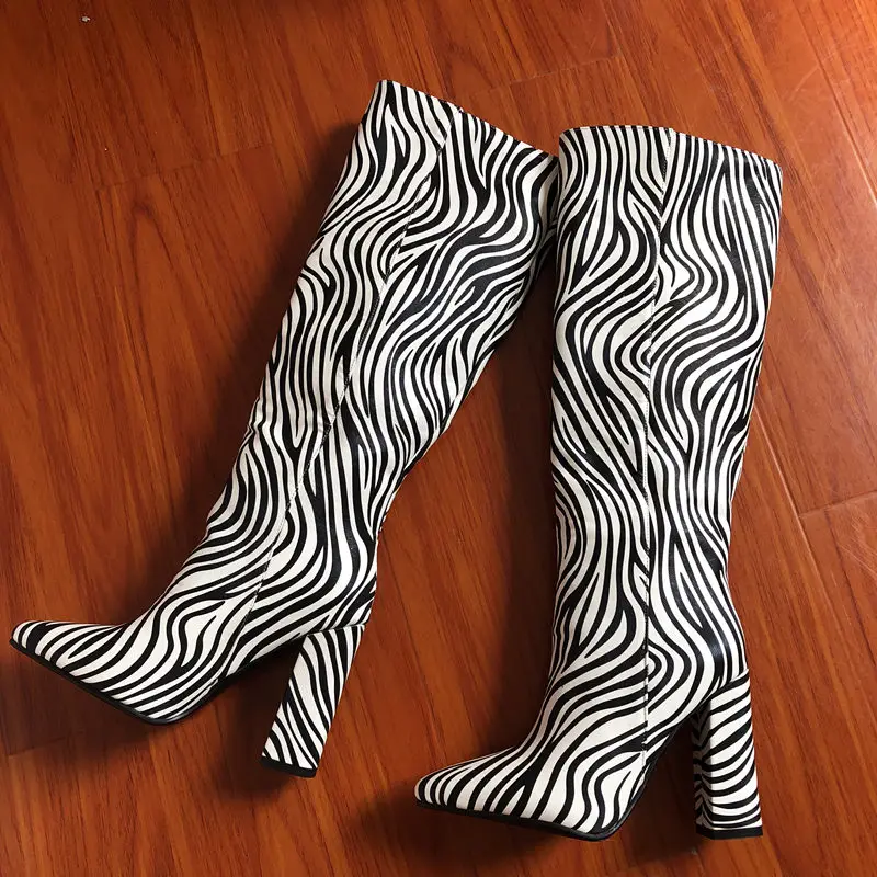 Женские сапоги до колена, с острым носком, на толстом блочном каблуке, с принтом зебры