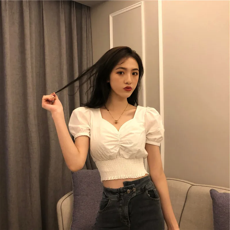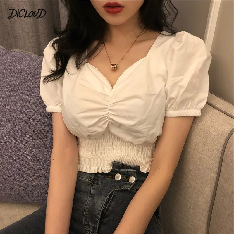 Особенности: сексуальная женская футболка с воротником, Модный женский короткий топ с пышными рукавами, тонкие черно-белые футболки размера плюс, женский милый топ