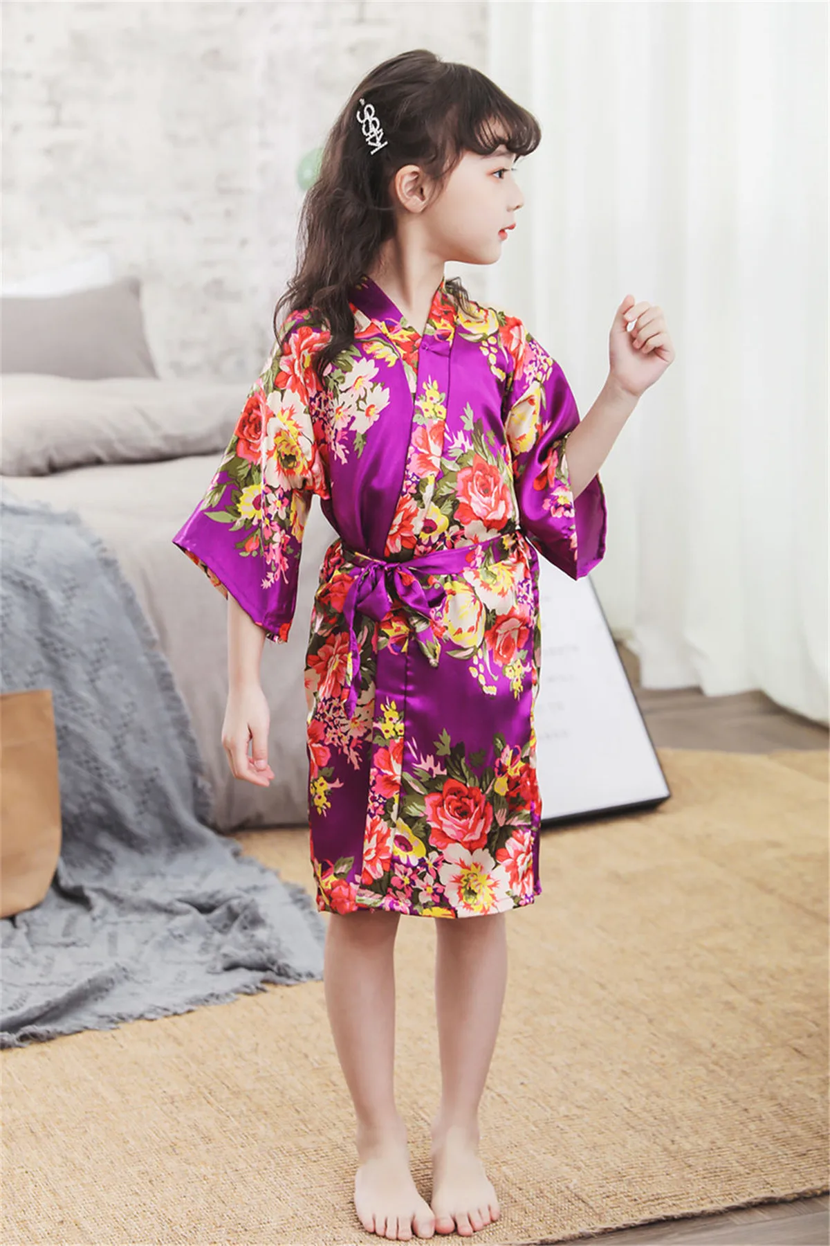 Детская шелковая одежда для сна для маленьких девочек, Свадебный Цветочный халат с пионами, цветочный халат для девочек, детский халат