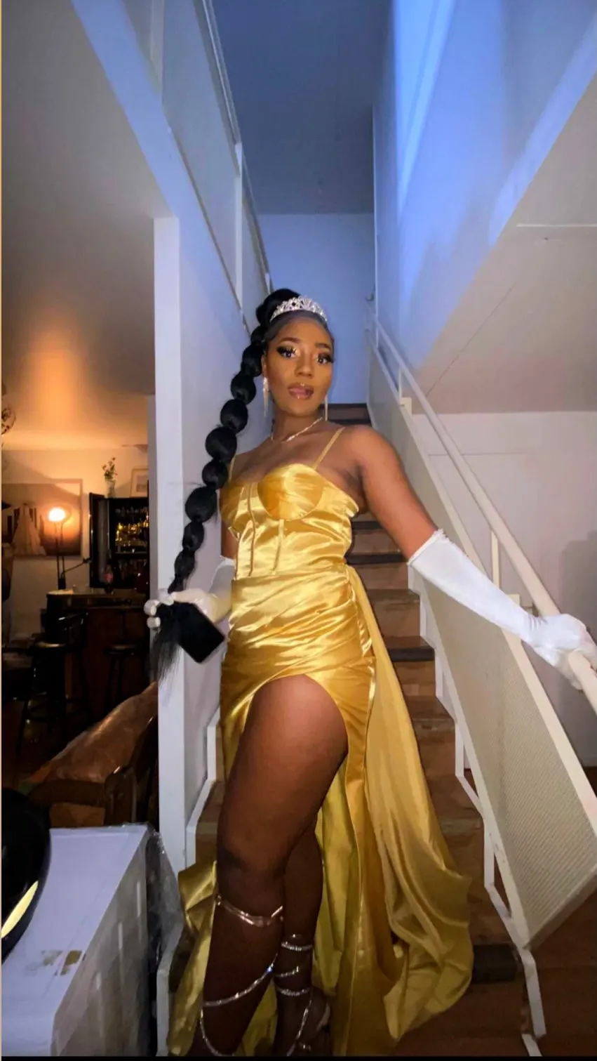 Женское длинное вечернее платье, с высоким разрезом, золотистого цвета