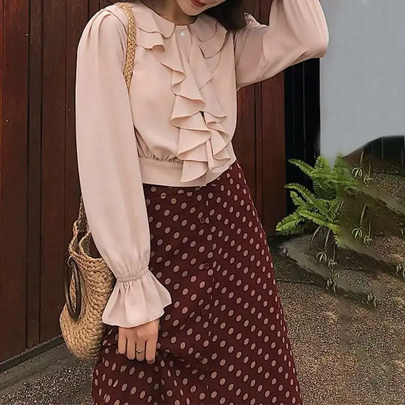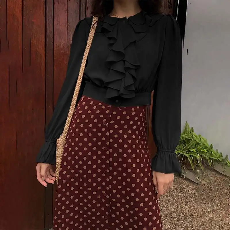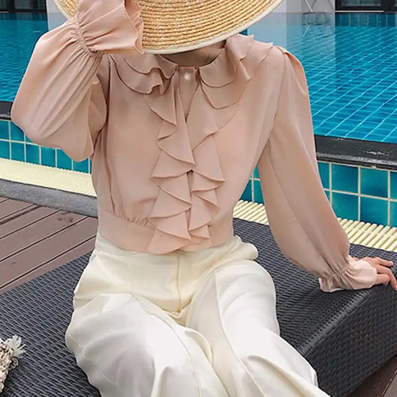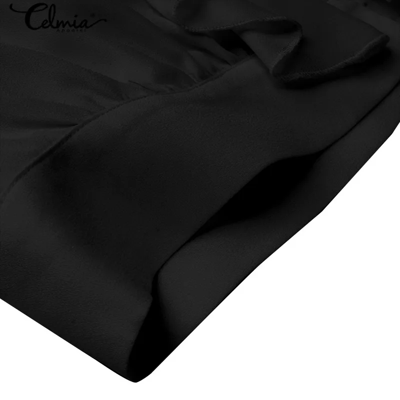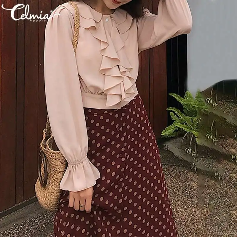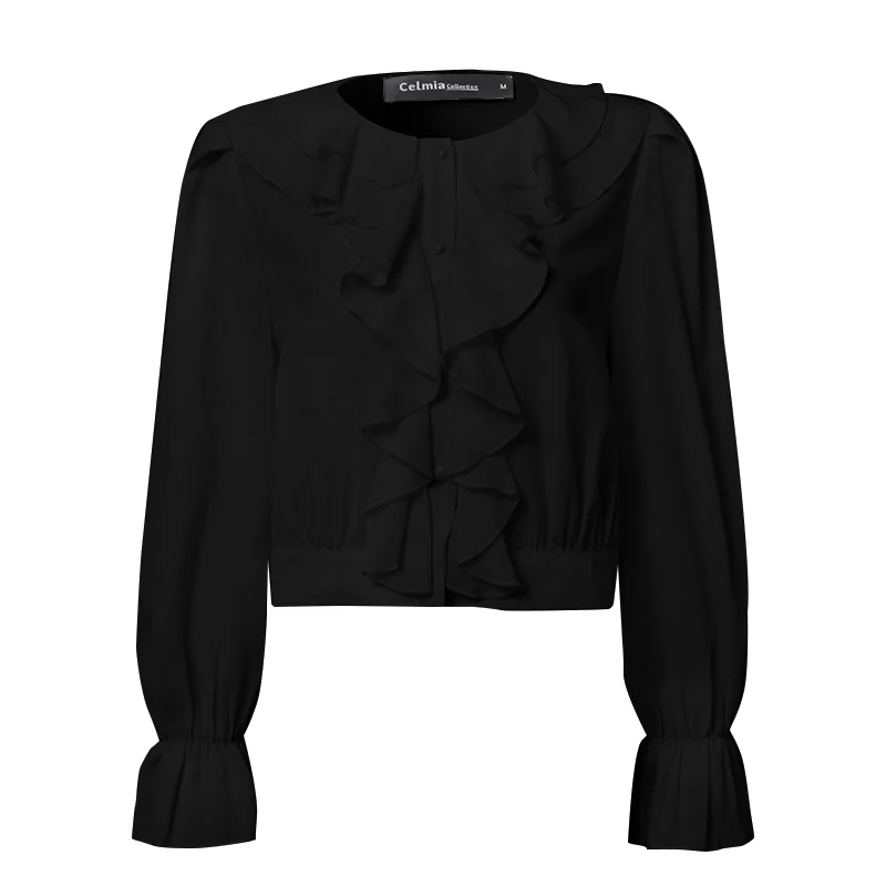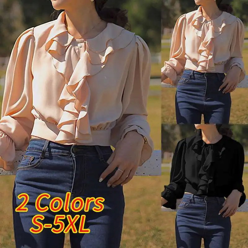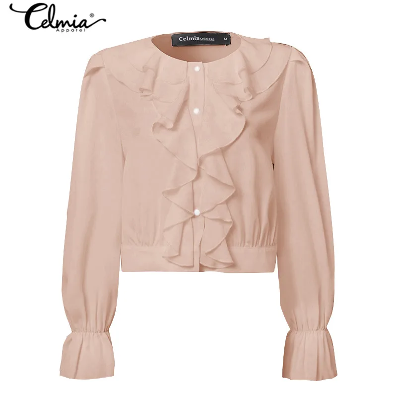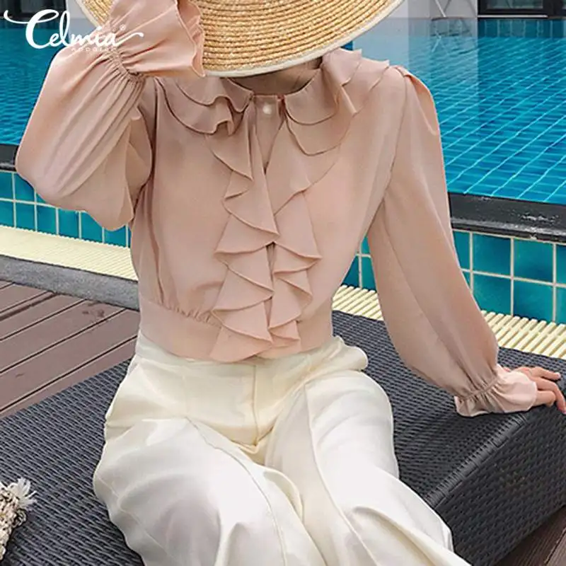 Женские шифоновые рубашки размера плюс Celmia, блузки с длинным рукавом, повседневные свободные однотонные Блузы с оборками и круглым вырезом, 5XL