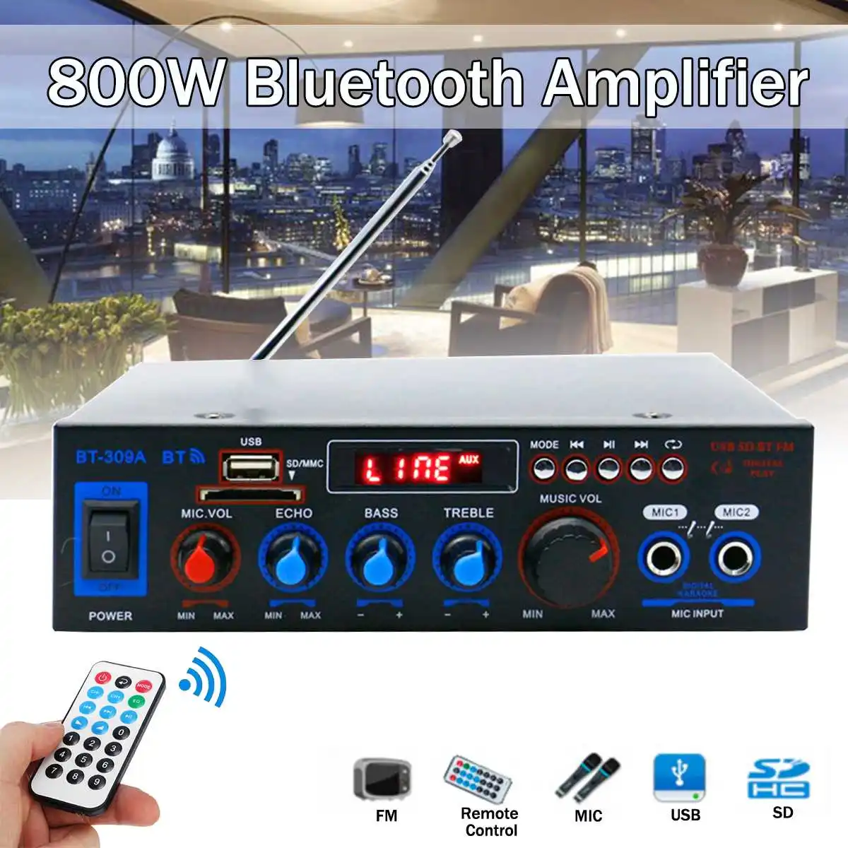 Усилитель bluetooth 800 Вт 110 В220 В постоянного тока 12 В AUX вход USB SD усилители для домашнего кинотеатра Автомобильные усилители аудио усилитель мощности