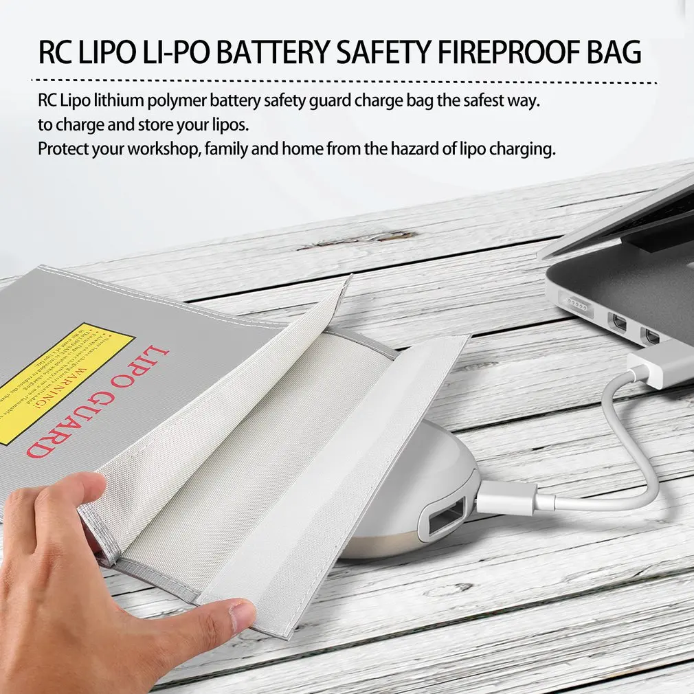 RC Lipo литий-полимерный аккумулятор Защитный чехол для зарядки самый безопасный способДля зарядки и хранения ваших lipos.Защитите свою мастерскую, семью и дом от опасности зарядки lipo.Это огнеупорная сумка, предназначенная для остановки иСодержит любой огонь, вызванный неправильной зарядкой слабо работающих пакетов lipo.Мы всегда настоятельно рекомендуем всем нашим клиентам всегда практиковаться с предельной осторожностьюПри зарядке литий-полимерных пакетов.Никогда не оставляйте зарядную литиевую батарею без внимания.Данная упаковка составляет 18 см x 23 см