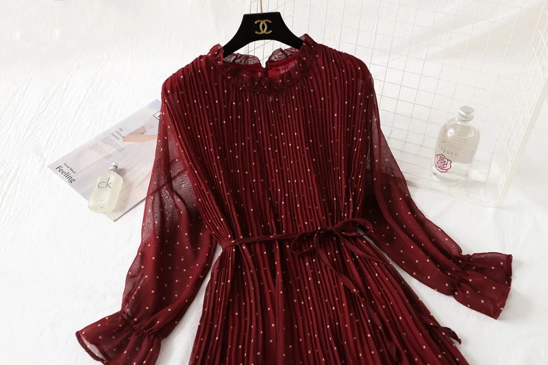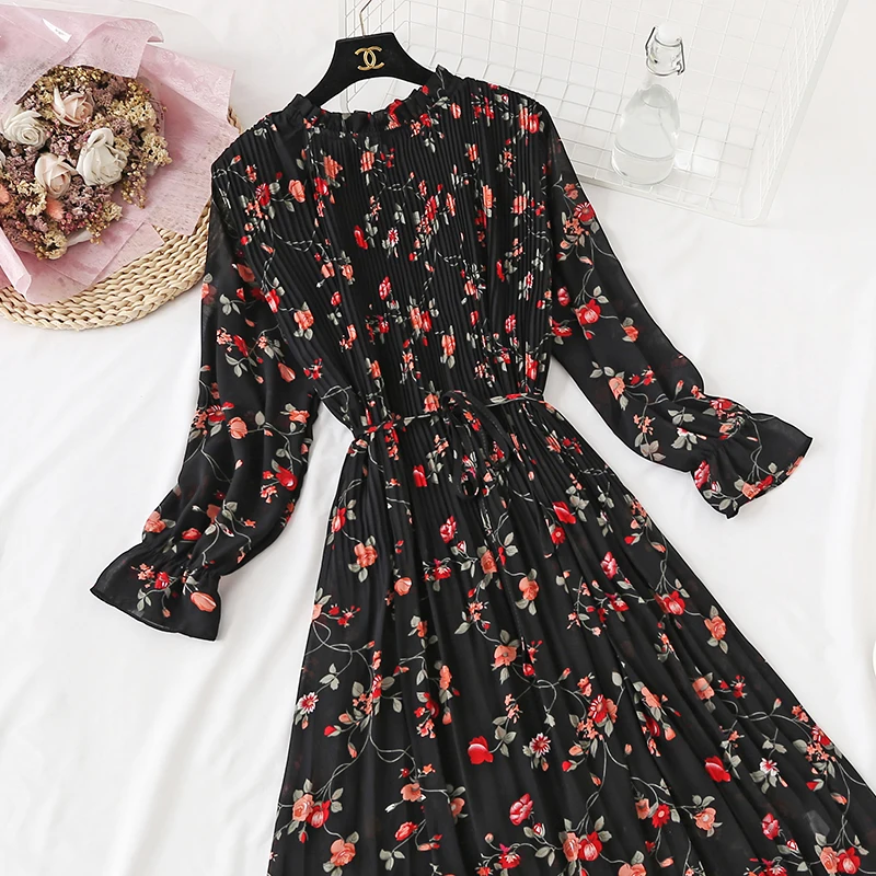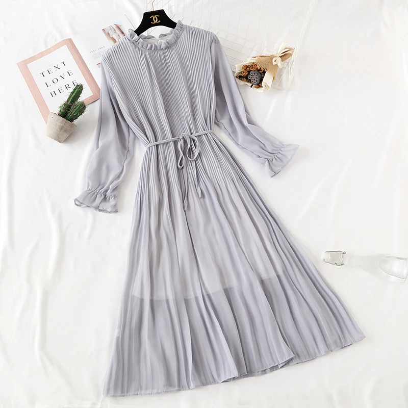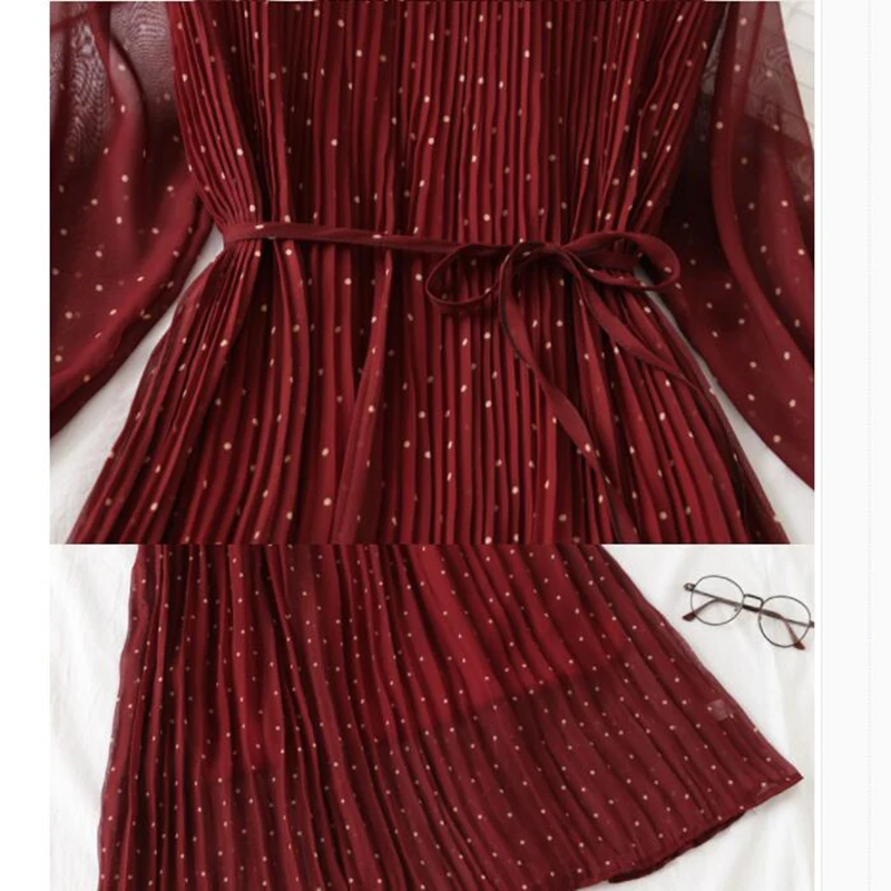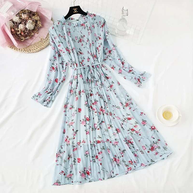 Платье женское шифоновое с принтом, элегантное Плиссированное повседневное миди-платье с длинным рукавом, воротником в форме листа лотоса, 2020