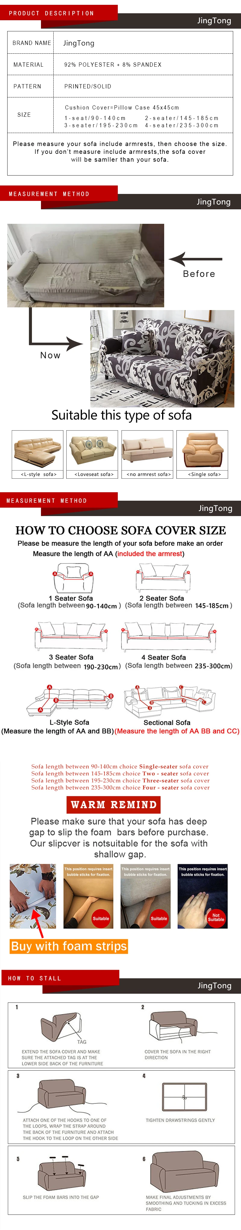 -Ткань высокой плотности защищает диван от неожиданных пятен. -Технология трафаретной печати используется для высокой цветостойкости. -Эластичная ткань для легкого нанесения. -Бандаж и губчатая планка обеспечивают идеальное прилегание и нескользящее сцепление. -Доступны в различных цветах и дизайне узоров, чтобы соответствовать любому интерьеру. -Можно использовать дома, в отеле или на специальных мероприятиях. -Поставляется в 4 размерах, подойдет для различных диванов и диванов. -Полностью машинная стирка. Размеры руководство Пожалуйста, тщательно измерьте размер вашего дивана. Также учитывайте подлокотники. Если вы не принимаете подлокотники во внимание, чехол для дивана может не поместиться на вашем диване. В комплект входит: 1 чехол для дивана Диван длина от 90 до 140 см выбор одноместный диван крышка Диван длина от 145 до 185 см выбор двухместный диван крышка Диван длина от 195 до 230 см выбор трехместный диван крышка Диван длина между 235-300 см выбор Четырехместный диван крышка Для секционного или углового дивана мы предлагаем приобрести 2 чехла. Размер чехла будет зависеть от длины линий AA, BB и CC. Например: если AA = 200 см, BB = 160 см, то вам следует выбрать 1 трехместный диван-чехол и 1 двухместный диван-чехол. Примечание: это фото-шоу продукта-это целый набор, только в качестве справки, но продается 1 шт. конкретных размеров, в выборе размера вы можете выбрать подходящий размер, Обычно один комплект дивана требует комбинированного размера! ! Если вы не знаете, как Чтобы выбрать, пожалуйста, свяжитесь с нами. Вежливое напоминание 1. Допускается погрешность в 1-4 см при ручном измерении 2. Если вы хотите другой размер, пожалуйста, свяжитесь с нами 3. Быстрая доставка, бесплатная доставка не означает, что вам не нужно платить дополнительный заказ 4. Размеры разных стран отличаются, пожалуйста, проверьте их перед покупкой 5. Из-за проблем с транспортировкой на большие расстояния, продукт будет немного складываться, продукт Не такой плоский, как на картинке, но не влияет на использование 6. Нет розничной упаковки, если вы хотите продать снова или в подарок, пожалуйста, подумайте о проблеме упаковки 7. Поскольку используются различные экраны, изображение может не отражать реальный цвет продукта. Однако мы гарантируем, что стиль будет таким же, как на изображении. 8. В случае возникновения каких-либо проблем при использовании нашего веб-сайта или размещении заказа, пожалуйста, свяжитесь с нами. Как измерить размер и как его установить, пожалуйста, смотрите на рисунке ниже