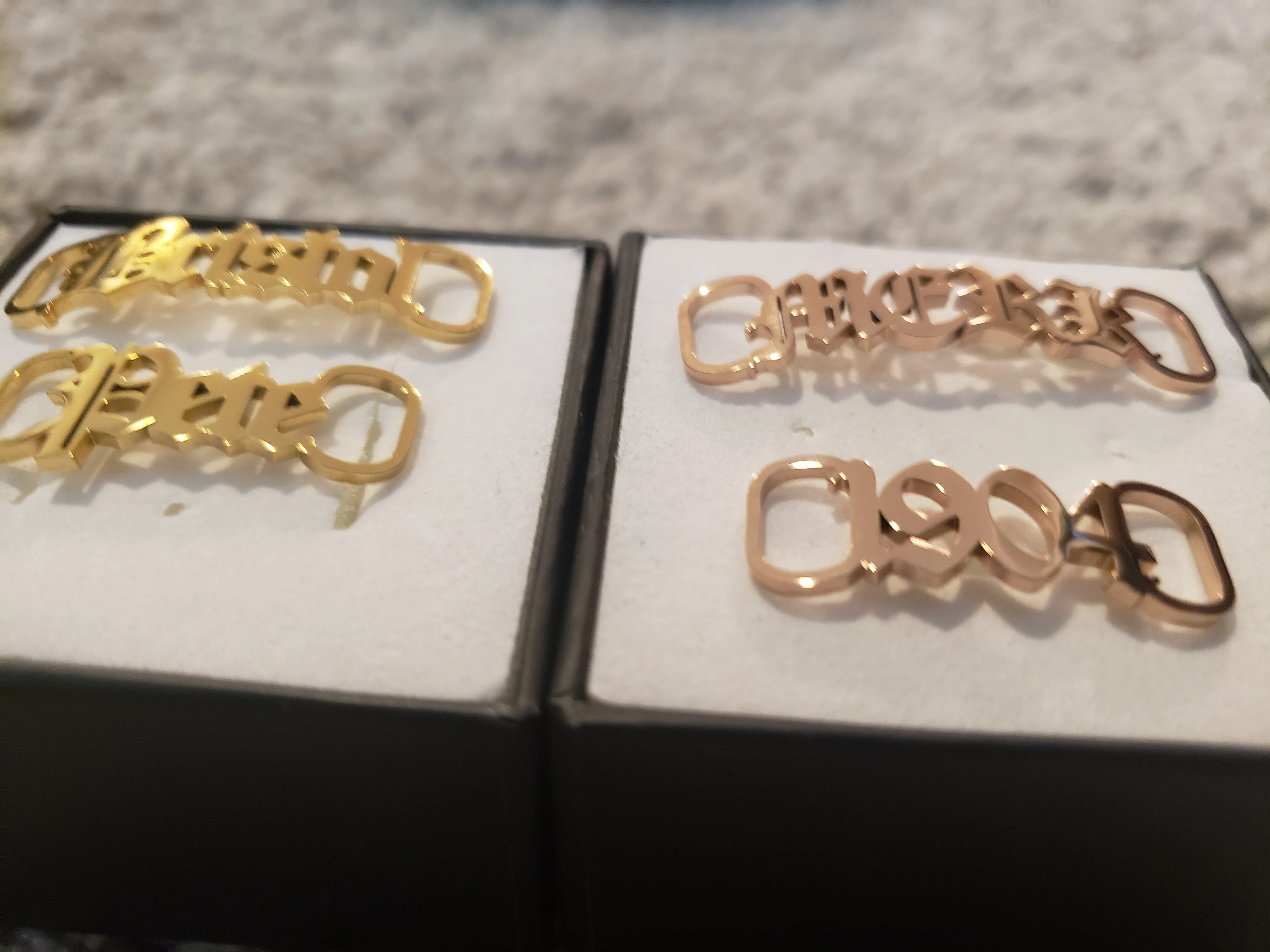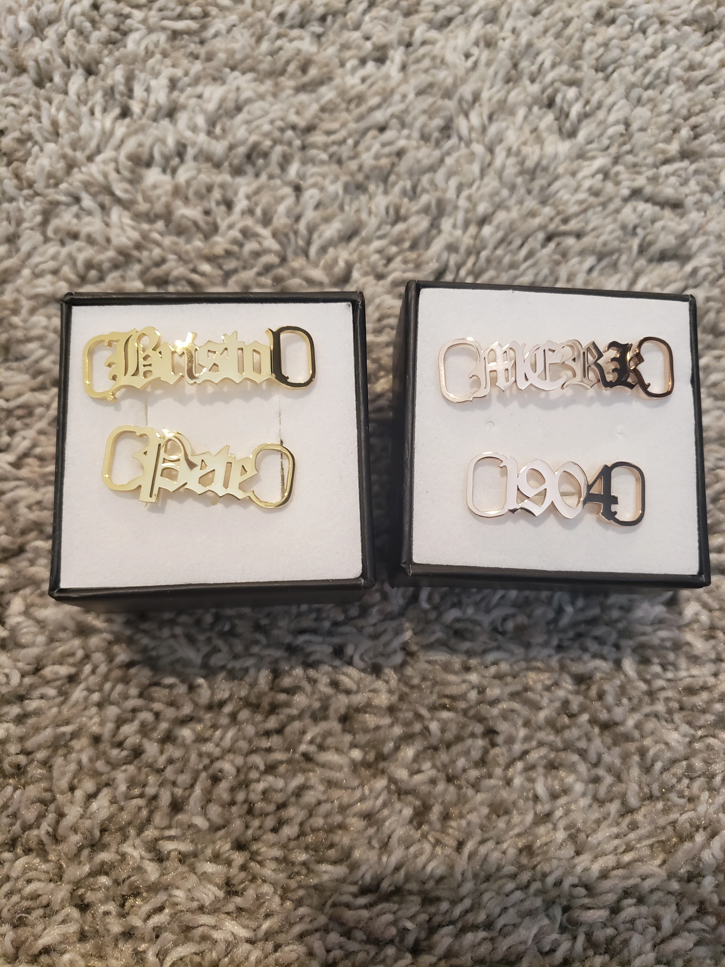 Я заказал "Bristol Pete" в золотом и "Merk 1904" в розовом золотом. Они выглядят потрясающе, они имеют небольшой изгиб, чтобы соответствовать вашей обуви. В конце концов я могу даже надеть на цепочку для браслета