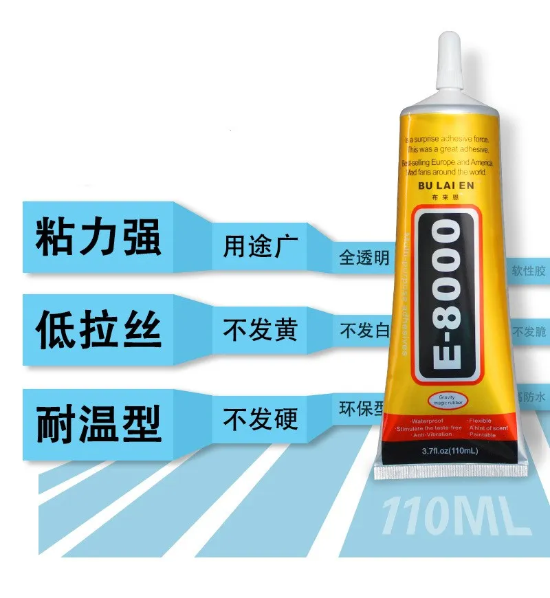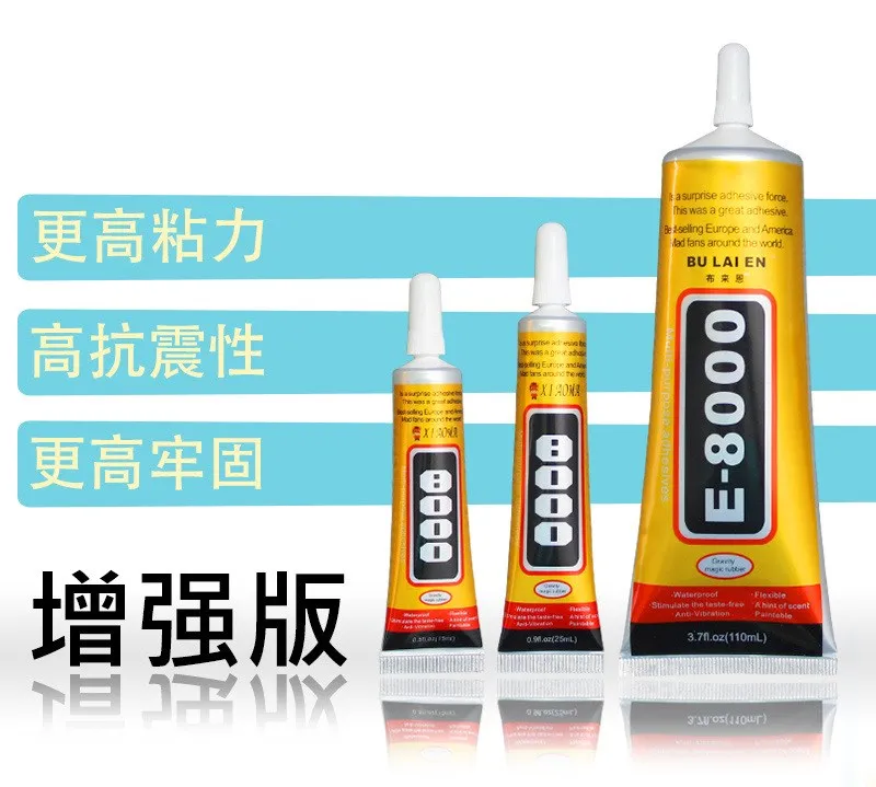 E-8000 клей широко используется в: PP/PE/PS/PO/PVC/ABS/резине, пластике, коже, губке, дереве, бумаге, кукольной игрушке, стекле, керамике, металле, линейный клей, точечное сверло Стразы для ювелирных изделий, окантовки, освещения, ткани, рукоделия, наушников, затычек для ушей и других материалов между взаимным адгезивом и самоклеящимся, Является выбором в производстве и работе.