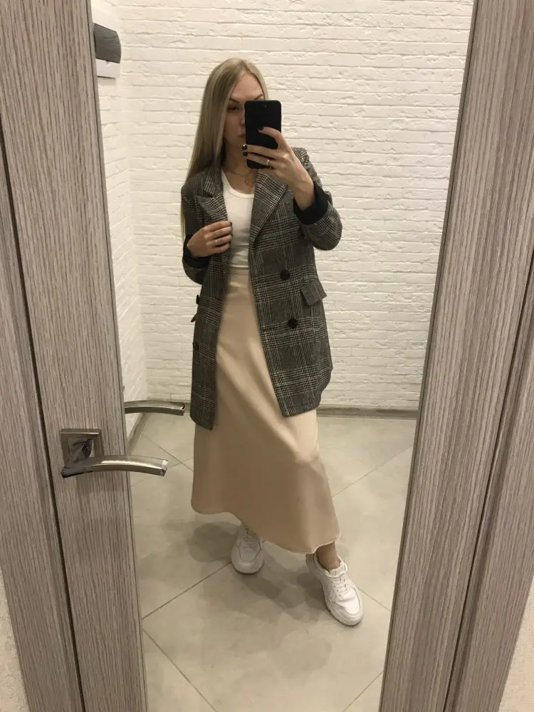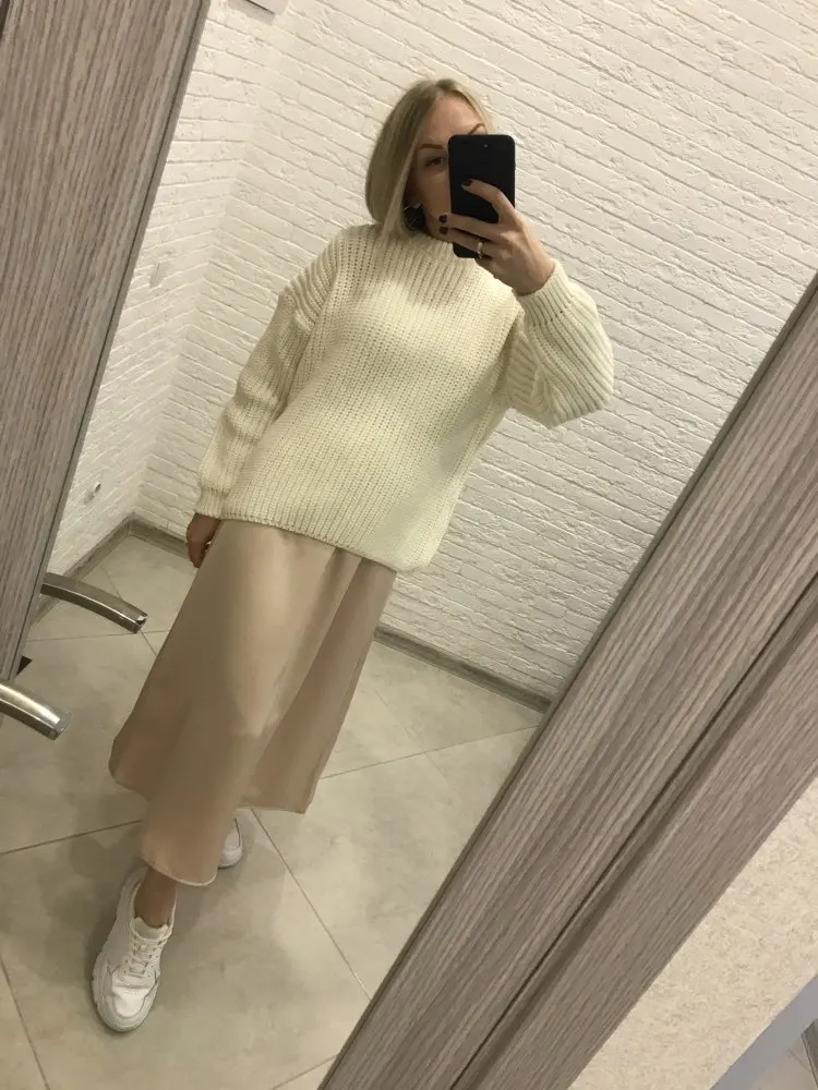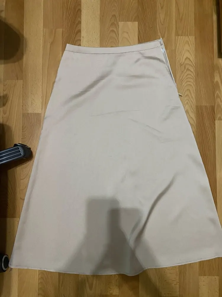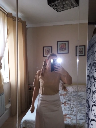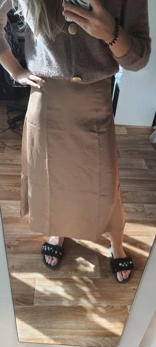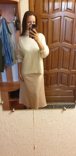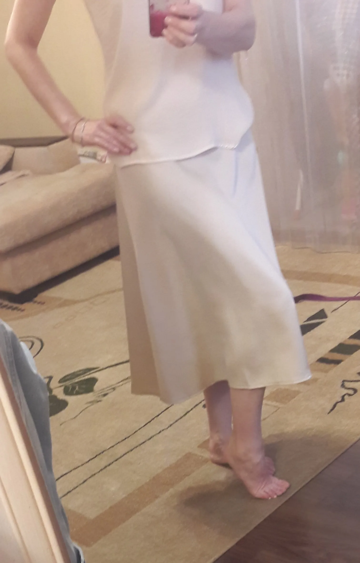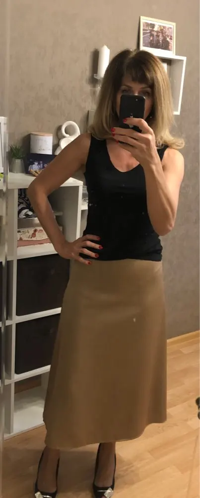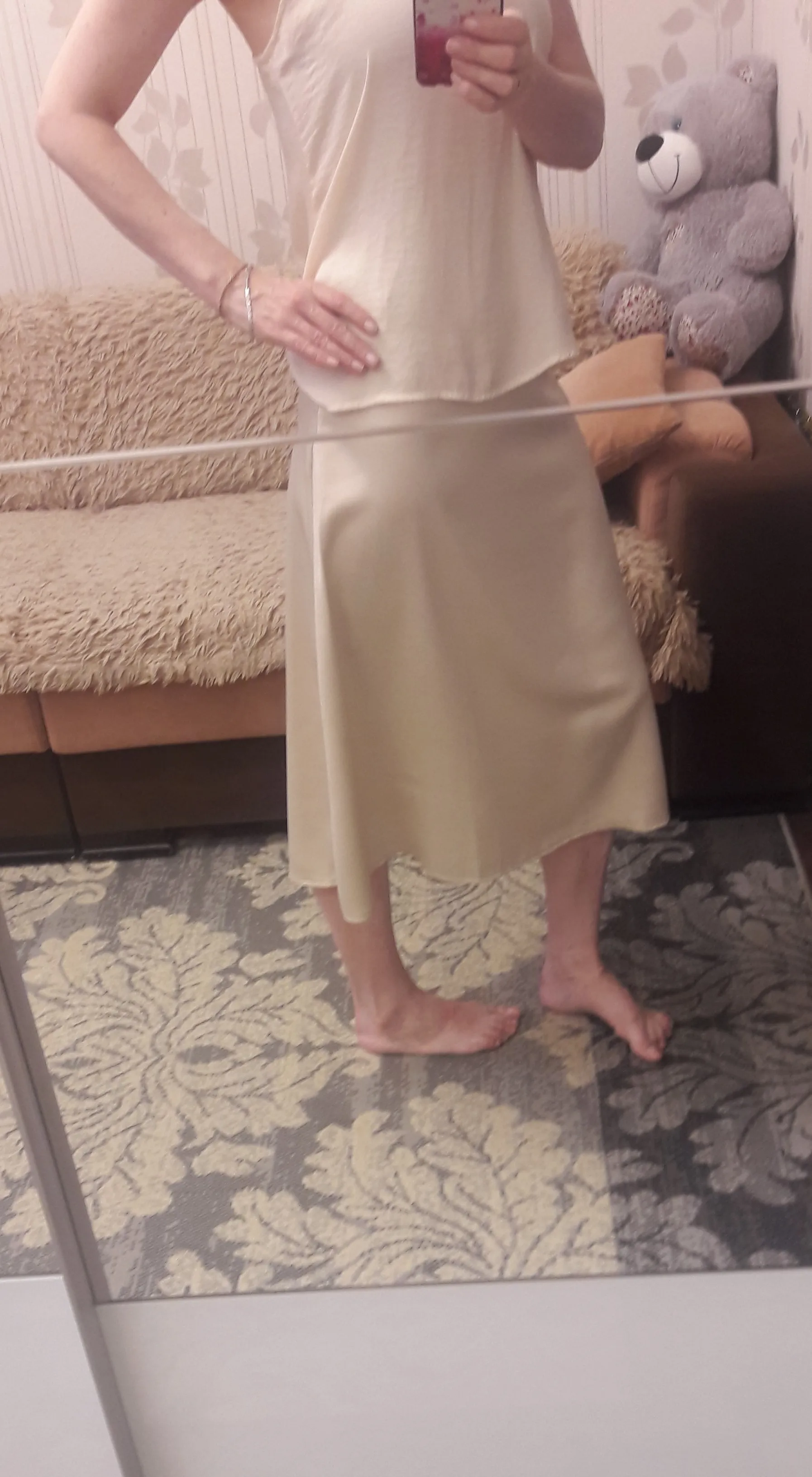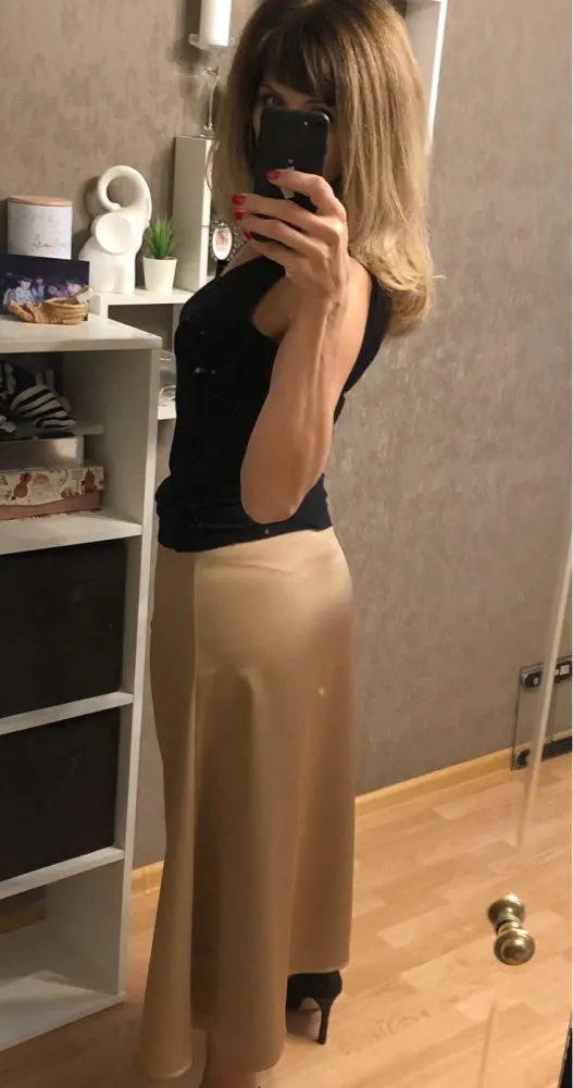 Юбка отличного качества! Плотный атлас! Заказывала бежевый цвет. На деле юбка пришла бежевого цвета с оливковым оттенком, немного темнее чем указано на сайте. Из минусов - на юбке остаются следы от всего, даже от воды, так что при ношении надо быть предельно аккуратной! Заказывала их самый маленький размер s, но при талии 60 см оказалась немного великовата. В целом юбка отличная!