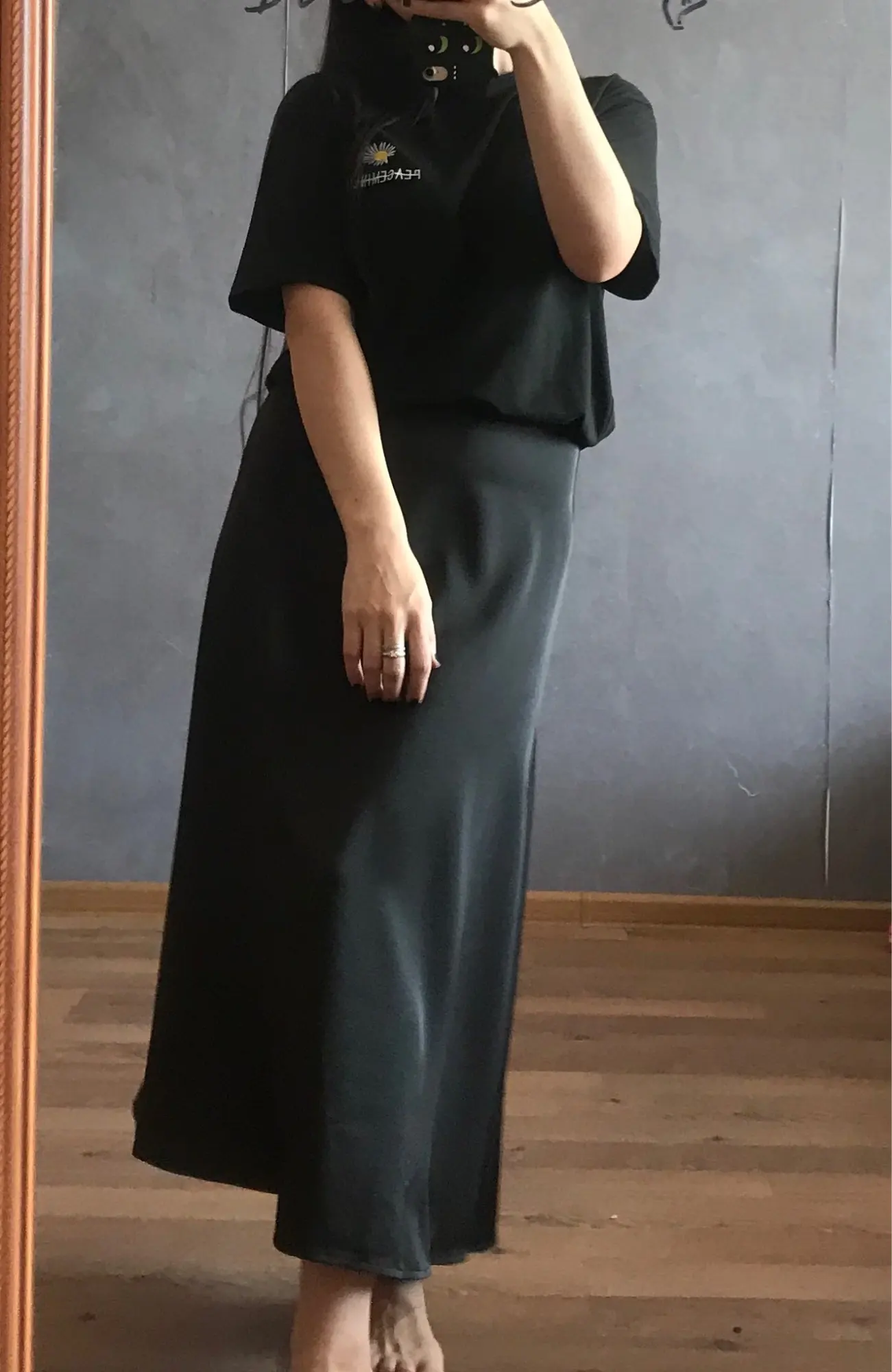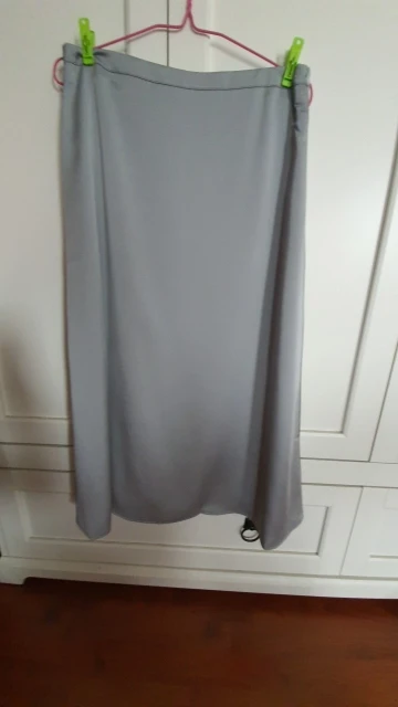 Приятная сатиновая ткань, чуть поблескивает, скользкая, даже капельки воды скатываются. Плотная, на мой вкус даже немного слишком, юбка как будто немного стоит колом, а не струится. Швы ровные, сверху внутри отстрочены тесьмой, снизу заоверлочены. А-образный силуэт и у меня высокая посадка получается за счет приличной разницы в талии и бедрах (65/95). Для идеальной посадки хочется добавить вытачки сзади, если хочется носить с чем-нибудь заправленным, иначе сборит выше попы. Длина до середины икры примерно, мой рост 165.