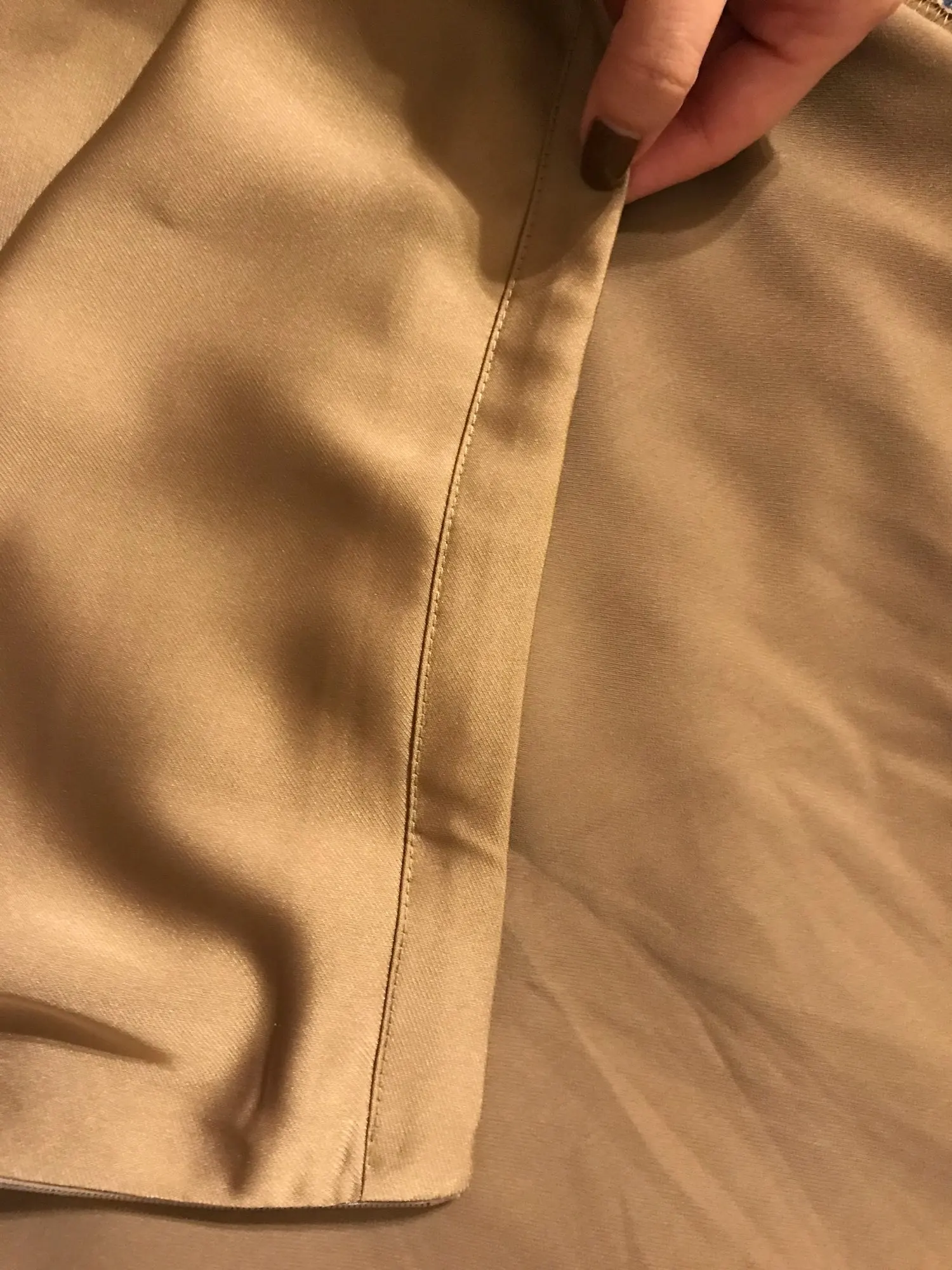 Великолепная, качественная юбка. Все строчки ровные, ткань гладкая, плотная, но струящаяся. Очень довпльна покупкой.