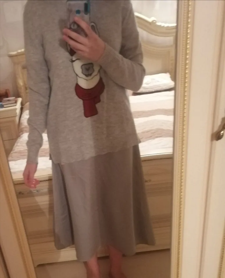 Пришла быстро, сшита качественно, ткань не атлас, больше похожа на подкладочную, ни одной нитки не торчало, у меня размер s, на параметры 88-75-96 мне впритык , ткань не тянется, так что учтите при заказе, покупала за 883 рубля с купонами, думаю с ней можно придумать много образов, с кардиганом например, но не зимой конечно, цвет как на фото, состав на юбке не указан