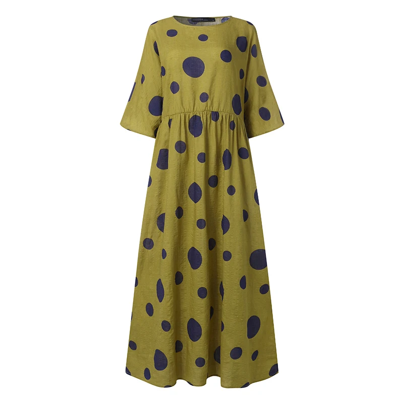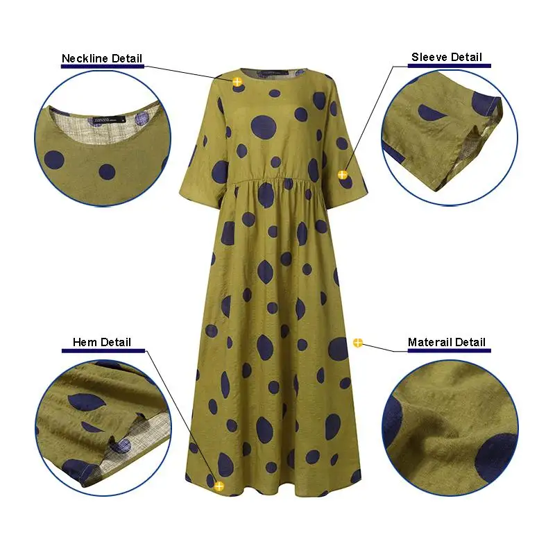 Материал: 65% хлопок + 35% искусственный шелкПосылка входит: 1 платьеСведения о продукте:-Рукав три четверти-О-образный вырез горловины-Повседневная Свободная-Длина до середины икры-Платье с принтом