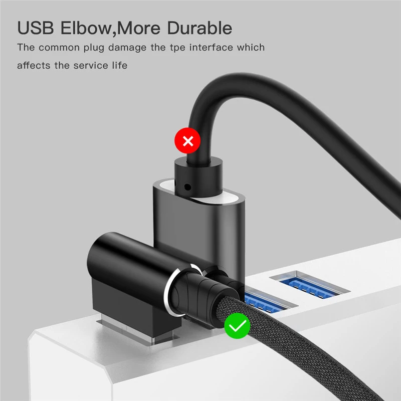 Этот кабель типа C имеет прямоугольную конструкцию на двух концах кабеля. Один конец-штекер типа c на 90 °, он более удобен и удобен для игры в мобильные игры во время зарядки. Никогда не мешает играть в игры. Вы можете выступать на 100% способностей в игре. Другой конец-штекер usb3.0 90 °, быстрая передача данных до 5 Гбит/с. Когда он вставляется в зарядное устройство usb, которое находится на рабочем столе, кабель естественно достает до вашей передней панели. Не похожа на прямую конструкцию, ее нужно сгибать каждый раз, и крышка кабеля через день сломается. Конструкция под прямым углом более прочная, не нужно сгибаться, потому что это выглядит так.