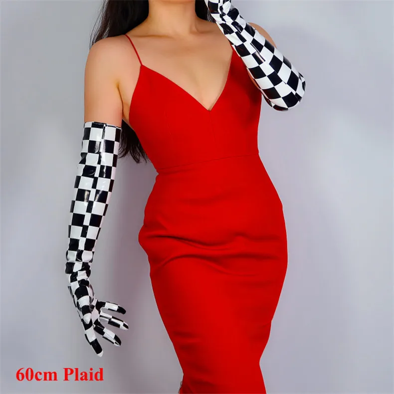 Латексные длинные перчатки из искусственной лакированной кожи, 28 дюймов, 70 см, в черно-белую клетку, длинные женские кожаные перчатки WPU215