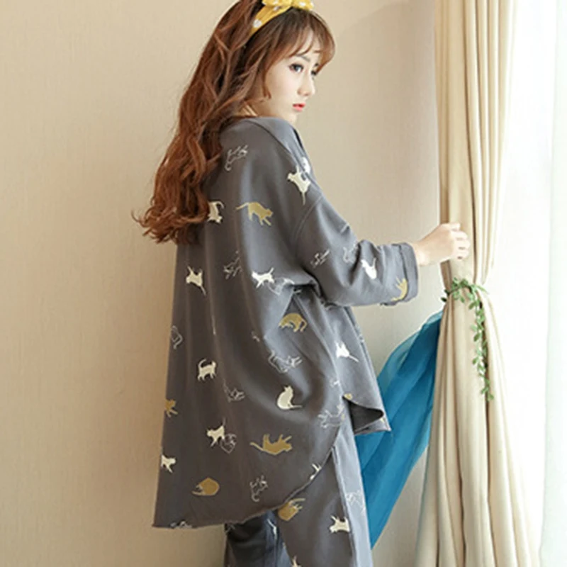 Пижама с круглым вырезом с длинными рукавами и рисунком кота + штаны для сна для женщин