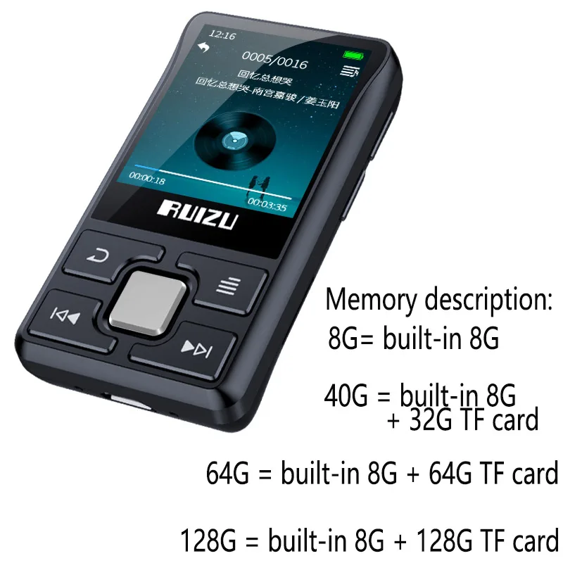 Описание памяти:8G = встроенный 8G40G = Встроенная TF-карта 8G + 32G64G = Встроенная TF-карта 8G + 64G128G = Встроенная TF-карта 8G + 128GПосылка:1x mp3-плеер1x проводные наушники1x USB-кабель1x Руководство пользователя
