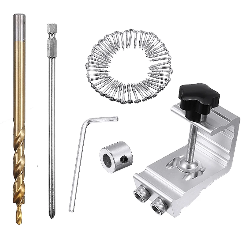 Набор джиг включает в себя: карманное отверстие джиг с зажимом, ступенчатое сверло (сменный), 3/8 дюйма. Стальной стопорный воротник, шестигранный ключ 6 дюймов. Квадратный привод, 45 тонких квадратных винтов.