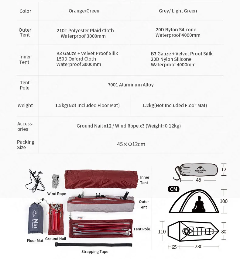 Палатка Naturehike Cloud Up на 1 человек, водонепроницаемая нейлоновая палатка для кемпинга на 1 человек, до 1,5 кг, 20D с силиконовым покрытием, туристическая с ковриком