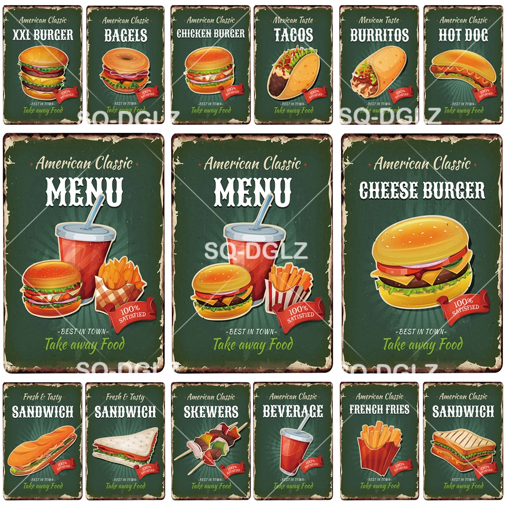 Металлическая табличка с изображением бургера колы, картофеля фри, металлическая винтажная Жестяная Табличка, металлический плакат, Настенный декор для ресторана