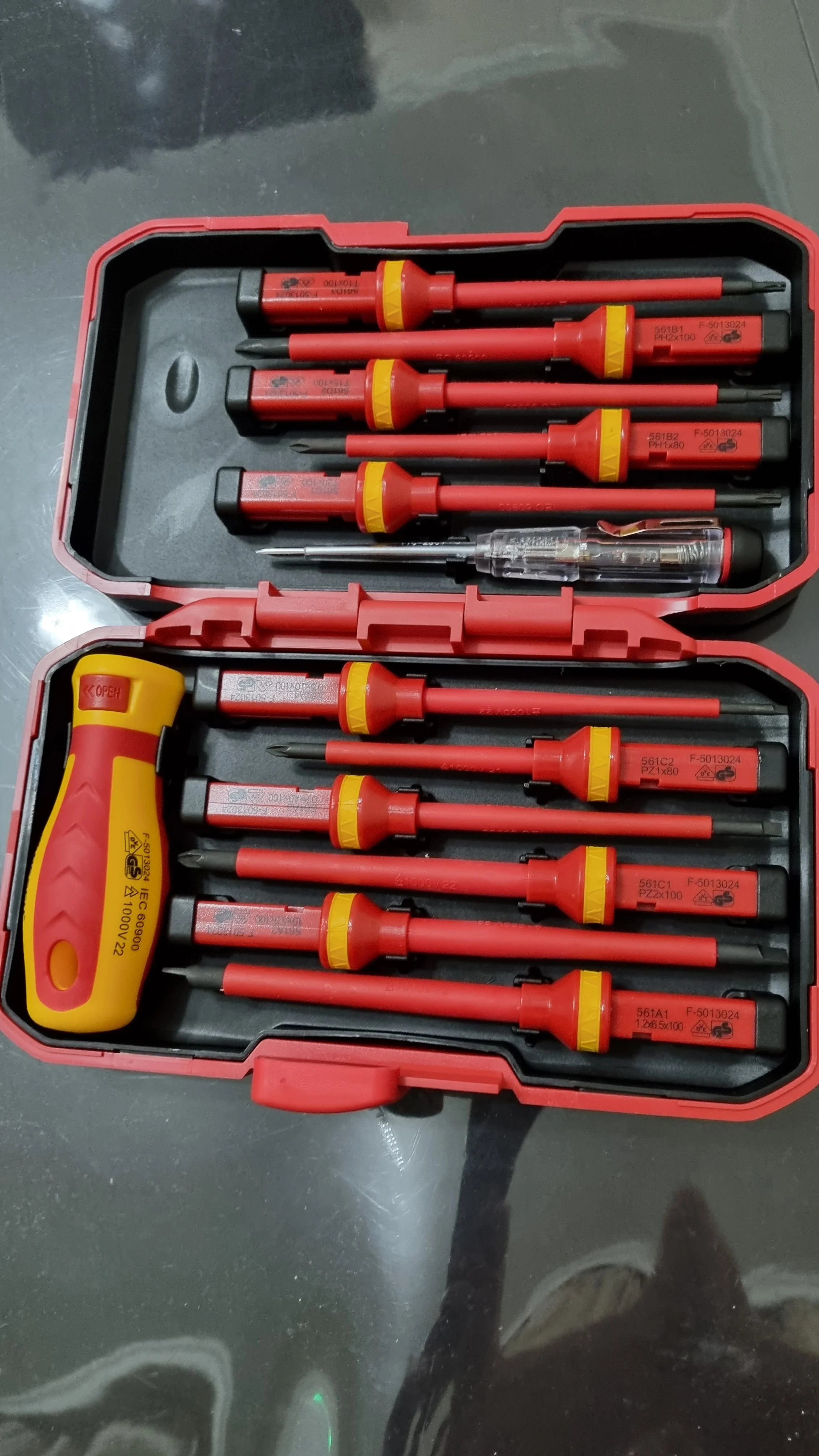 Это профессиональный набор инструментов для электриков для выполнения различных видов электромонтажных работ или других ремонтных работ. Независимо от того, выполняете ли вы электрический ремонт или просто ЕЖЕДНЕВНЫЙ РЕМОНТ, в общем, этот набор должен быть у любого разнорабочего или электрика ящика для инструментов. Особенности: Эргономичная ручка для максимального комфорта и исключительного крутящего момента. Включает различные типы бит для удовлетворения различных электрических потребностей. Содержит магнитные наконечники, удобно притягивающие винты. Изолированная конструкция, выдерживающая напряжение до 1000 В. Изготовлен из хромованадиевой стали, закаленной для максимальной износостойкости. Конструкция наконечника, простая установка и замена, экономия времени и эффективность. В комплекте чехол, удобный для хранения и портативный для использования. Технические характеристики: Цвет отвертки: красный + черный + желтый Цвет ручки: красный + желтый Выдерживаемое Напряжение: 1000 в Материал отвертки: хром-ванадиевая сталь Материал ручки: PP + TPR Длина ручки: прибл. Высота каблука 10 см/3.9in Длина тестера напряжения: прибл. 14 см/5.5in Набор включает в себя: -- Шлицевая отвертка: 0,5x3,0x100, 0,8x4,0x100, 1,0x5,5x100, 1,2x6,5x100 -- Крестовая отвертка: PH1x80, PH2X100 -- Отвертка Pozidriv: PZ1x80, PZ2x100 -- Отвертка Torx: T10x100, T15x100, T20x100 -- Напряжение тестер -- TPR ручкой Чехол Размеры: прибл. 21,5*13*4,3 см/8,5*5,1 * 1.7in Вес посылка: прибл. 790 г/27,9 унций Примечание: Тестер напряжения может использоваться только в указанном диапазоне напряжения. Посылка список: 1 * Набор отверток 1 * чехол 2 * Руководство пользователя (на английском языке)