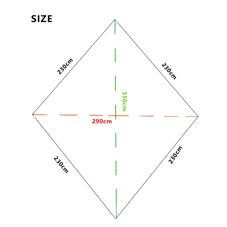 Вес: около 600 гРазмер: 350х290смМатериал: 210t клетчатая тканьУровень водонепроницаемости: более 3000 ммПосылка включает в себя: 1 брезент, 4 веревки, 2 колышка, 1 мешок, не включает опорные палкиХарактеристики: Защита от УФ-лучей, водонепроницаемость (герметичный шов), защита от ветра